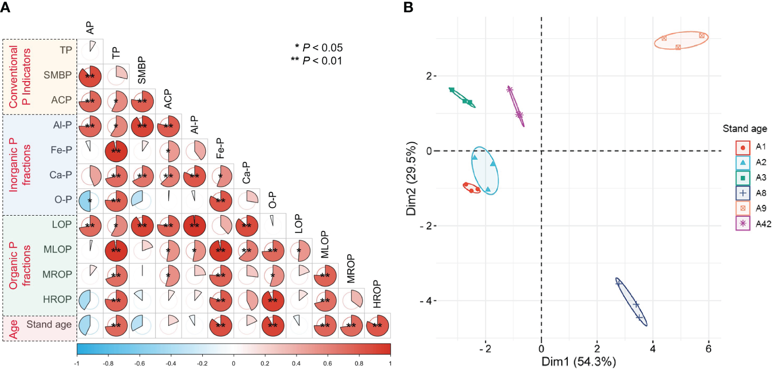 The statistical analysis was performed using the IBM SPSS software package (version 24.0, SPSS Inc., Chicago, IL, USA) and R software environment (version 4.0.5, R Core Team, 2021). One-way analysis of variance (ANOVA) was performed using SPSS to test the significance of differences in soil physicochemical properties and P characteristics among stands of different ages. Significance levels were set at P< 0.05 and P< 0.01.