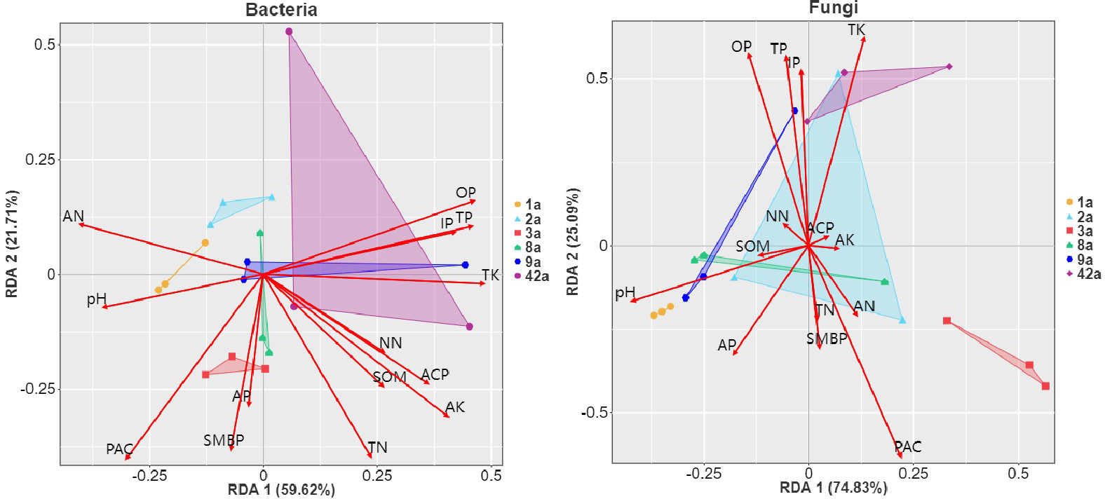 Our findings revealed that the rhizosphere soils across stand ages were in a strongly acidic and P-deficient state, with pH values ranging from 3.4 to 4.6, and available P contents ranging from 2.6 to 7.9 mg·kg-1. The adsorption of P by Fe3+ and presence of high levels of steady-state organic P highly restricted the availability of P in soil. On long time scales, acid phosphatase activity and microbial biomass P were the main drivers of P activation. Moreover, pH, available P, and ammonium nitrogen were identified as key factors driving microbial community diversity. As stand age increased, most of the nutrient content indicators firstly increased and then decreased, the conversion of other forms of P to bio-available P became difficult, P availability and soil fertility began to decline. However, bacteria were still able to maintain stable species abundance and diversity. In contrast, stand age had a greater effect on the diversity of the fungal community than on the bacteria. The Shannon and Simpson indices varied by 4.81 and 0.70 for the fungi, respectively, compared to only 1.91 and 0.06 for the bacteria. Microorganisms play a dominant role in the development of their relationship with soil P.