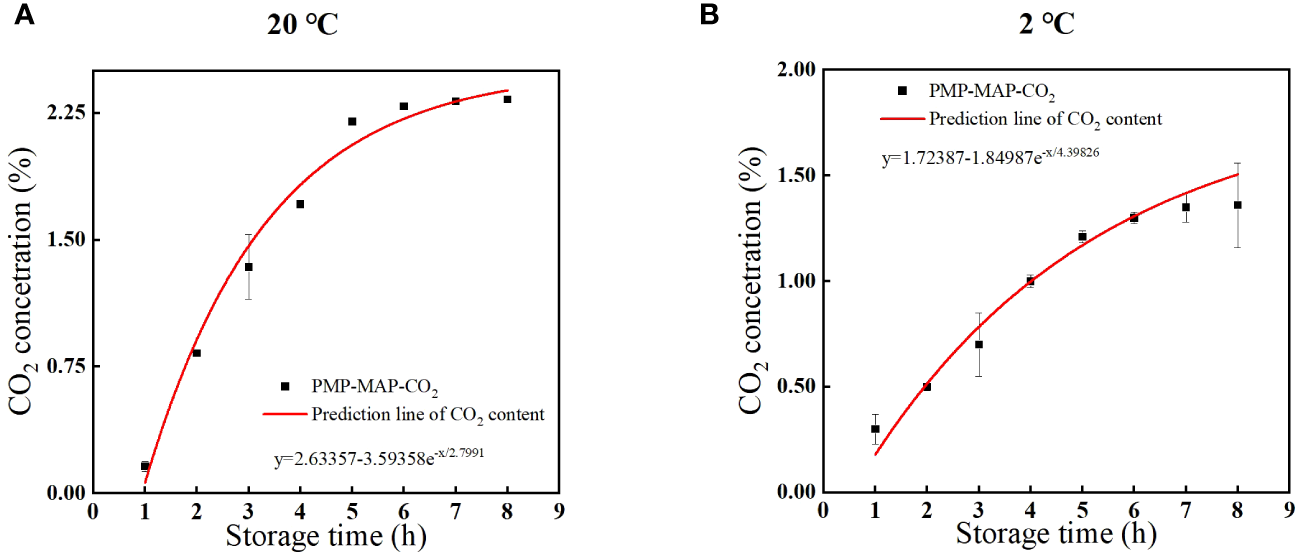 As shown in Figure 2, the CO2 concentration in the PMP-MAP underwent a significant increase during 20°C and 2°C storage and achieved equilibrium 2.2% and 1.5% within 8 h, met the optimal steady-state 1.0-2.0% mentioned above.