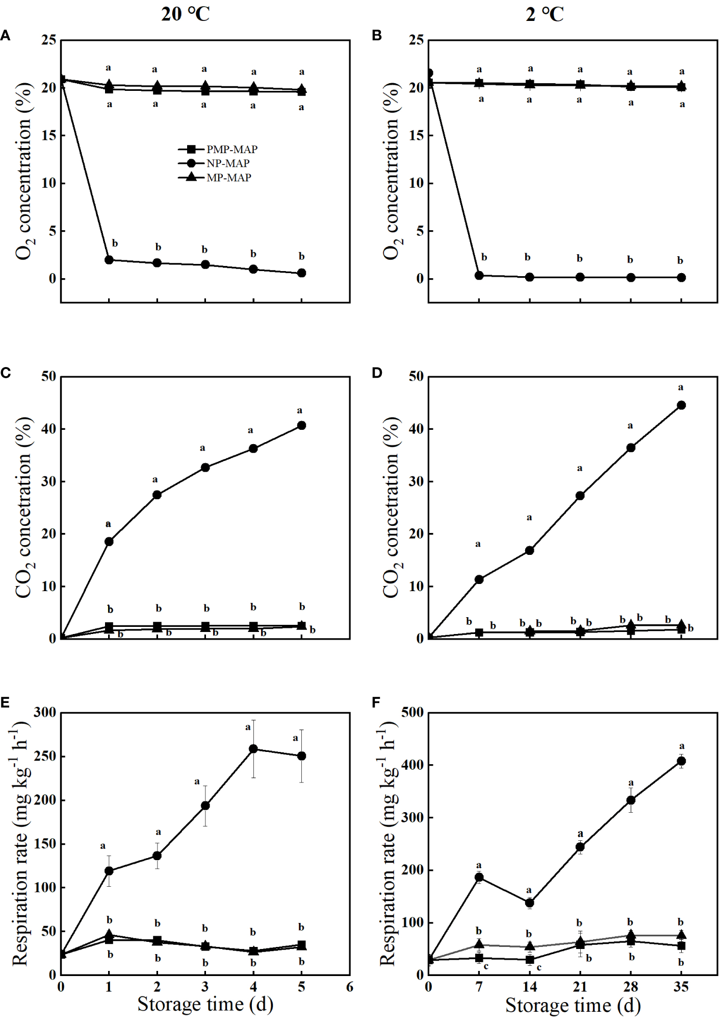 Effects of PMP-MAP on O2 concentration (A, B), CO2 concentration (C, D) and respiration rate (E, F) in winter jujube at 20°C and 2°C. Vertical bars represent standard deviations of the means. The different superscripts indicate statistically significant differences between PMP-MAP and MP-MAP, NP-MAP fruit (P< 0.05). MP-MAP, macro-perforated MAP; PMP-MAP, precise micro-perforated MAP; NP-MAP, non-perforated MAP.