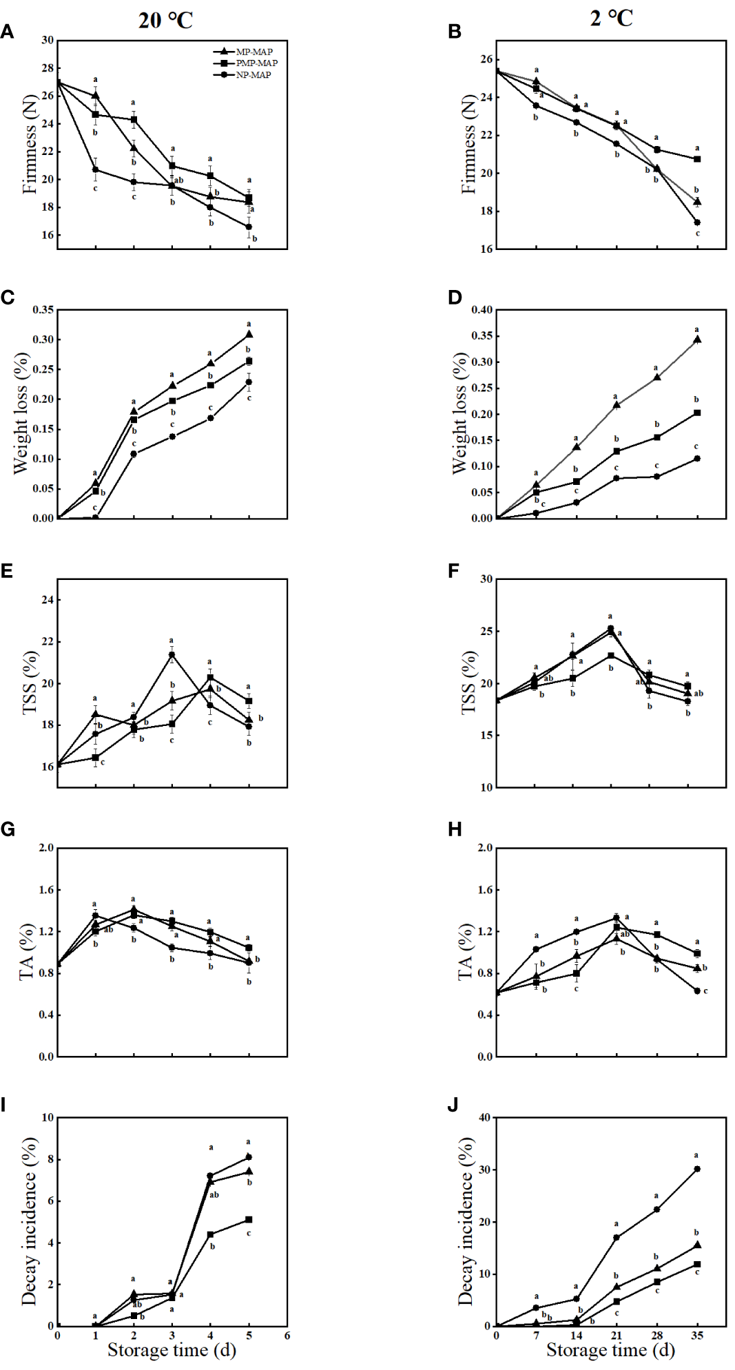 Effects of PMP-MAP, MP-MAP and NP-MAP on firmness (A, B), weight loss (C, D), TSS (E, F), TA (G, H) and decay incidence (I, J) of winter jujube fruit during shelf life at 20°C and 2 °C. The data presented are the mean values of three replicates; vertical bars represent the standard errors of the mean values; values followed by different superscripts (A–J) are significantly different (P< 0.05) on the same sampling date. MP-MAP, macro-perforated MAP; PMP-MAP, precise micro-perforated MAP; NP-MAP, non-perforated MAP.