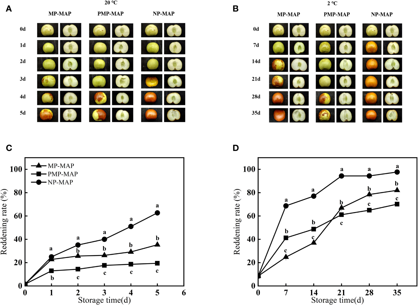 Reddening in winter jujube fruit during different temperature storage (A, B) and reddening rate (C, D). MP-MAP, macro-perforated MAP; PMP-MAP, precise micro-perforated MAP; NP-MAP, non-perforated MAP.