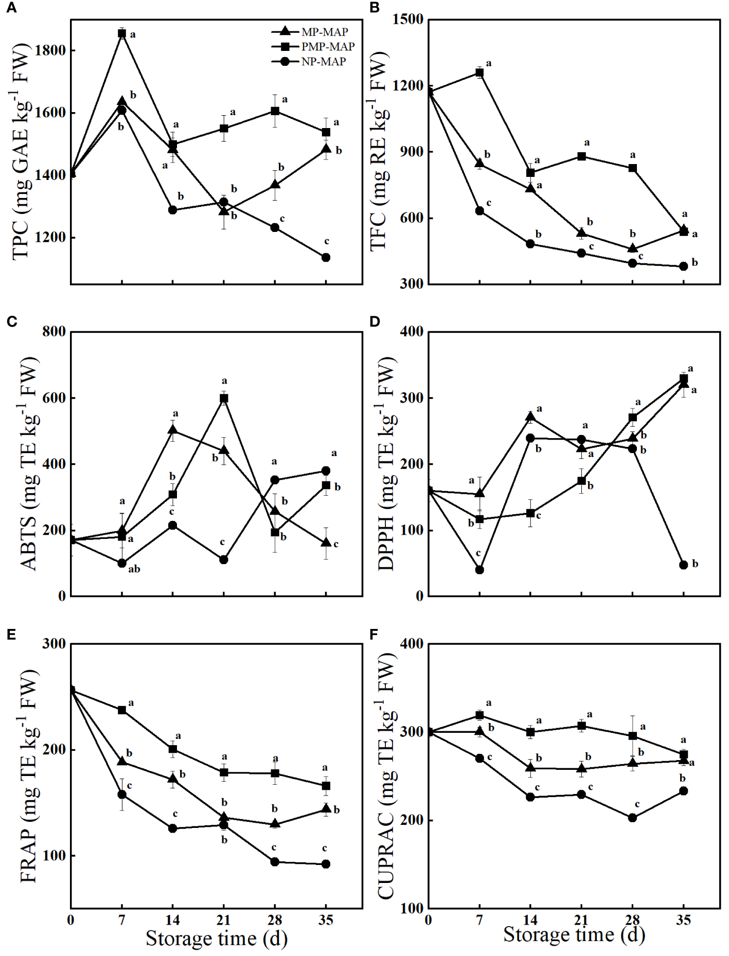 Effect of PMP-MAP on total phenolic content (TPC, A), total flavonoid content (TFC, B), ABTS free radical scavenging assay (ABTS, C), DPPH free radical scavenging assay (DPPH, D), Ferric reducing antioxidant power assay (FRAP, E) and Cupric ion reducing antioxidant capacities assay (CUPRAC, F) of winter jujube during cold storage at 2°C for 35 d. TPC is reported in gallic acid equivalent (GAE), TFC is reported in rutin equivalent (RE), and antioxidant capacities are reported in trolox equivalents (TE). Bars represent standard deviation of the mean. Different letters above the bars within the same time indicate significant difference at P< 0.05 level. MP-MAP, macro-perforated MAP; PMP-MAP, precise micro-perforated MAP; NP-MAP, non-perforated MAP.