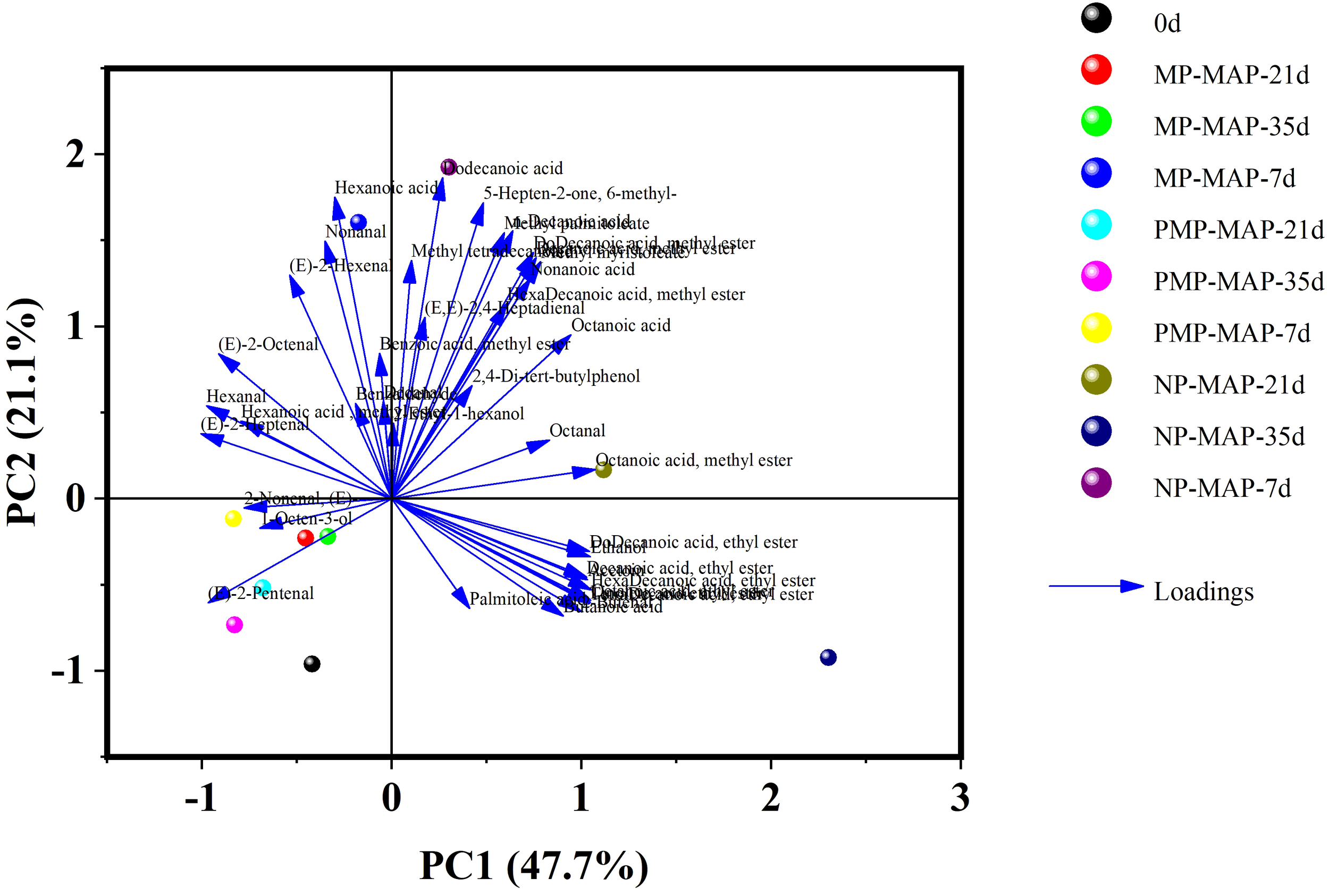 As shown in Figure 7, the first and second principal components (PC1 and PC2) contributed to 47.7% and 21.1% of the total variance respectively. The winter jujubes in PMP-MAP were distinctly segregated from those in other packaging types, demonstrating significant variations in aroma composition, particularly in (E)-2-Nonenal, 1-octen-3-ol, and (E)-2-Pentenal—common aromas in winter jujube. Compared to NP-MAP, the aroma of PMP-MAP packaged jujube at each storage interval is closer to the baseline, signifying that PMP-MAP has a better efficacy in preserving winter jujube’s aroma and flavor. With extended storage time, winter jujubes in NP-MAP produced a significant amount of absent VOCs (Volatile Organic Compounds) in fresh winter jujube, primarily esters, aldehydes, and acids included off-flavor substances such as decanoic acid ethyl ester, ethanol, butanoic acid, and pentanoic acid, etc. odorant.