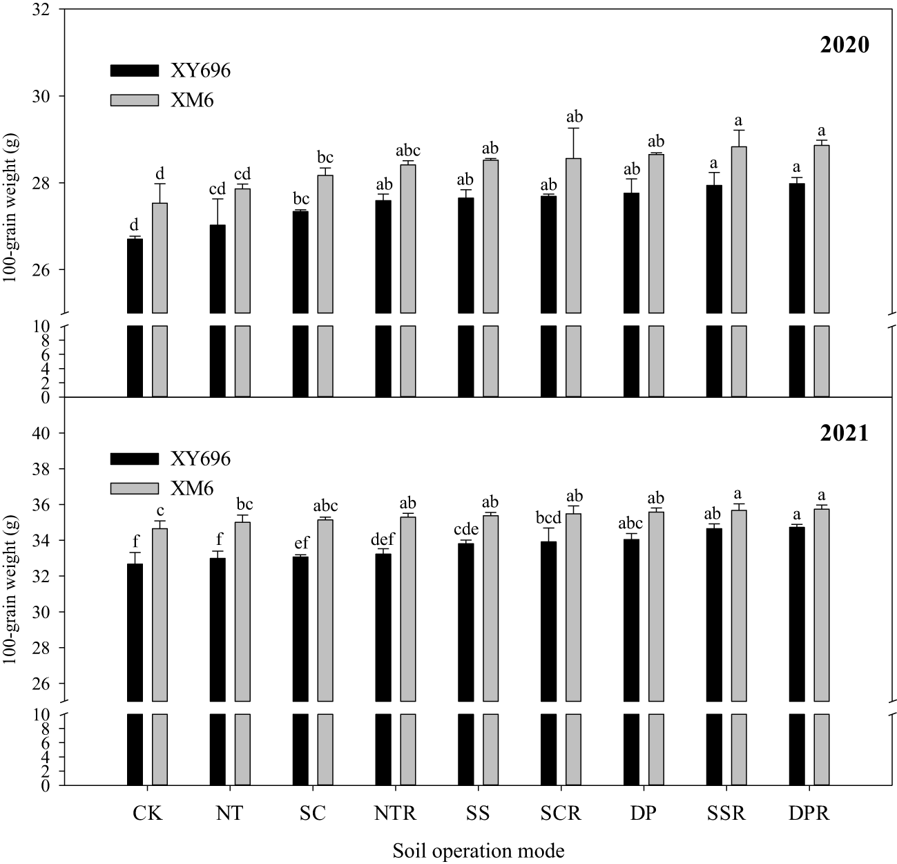 The 100-grains weight of XM6 exceeded that of XY696 under the farmer’s rotary tillage treatment (CK) by 3.11% in 2020 and 6.05% in 2021 (Figure 2). Various tillage and straw return methods led to changes in the 100-grains weight of each maize variety, with straw incorporation with subsoiling (SSR) and straw incorporation with deep tillage (DPR) showing superior performance. In 2020, the 100-grains weight of XY696 significantly increased by 4.66% and 4.80% under SSR and DPR treatments, respectively, compared to CK; similarly, XM6’s weight increased by 4.73% and 4.84%. In 2021, under similar contrast conditions, the 100-grains weight of XY696 saw a significant increase by 6.05% and 6.28%, while XM6’s weight increased by 2.95% and 3.15%.