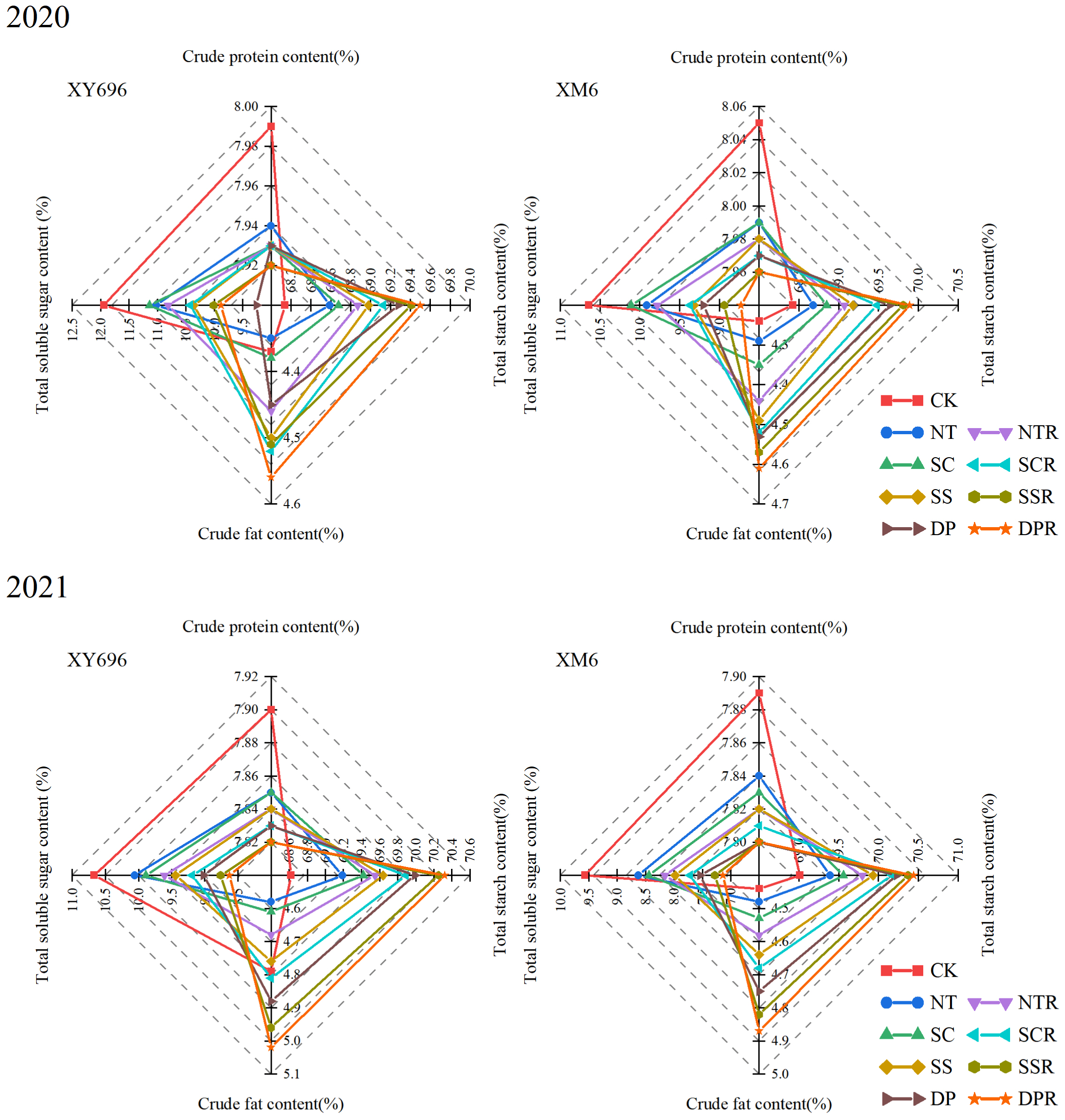 Figure 3 illustrates a quadratic trend in the grain filling rate under each treatment, characterized by an initial increase followed by a decrease. In CK, the peak grouting rate of XM6 surpassed that of XY696, and the time of peak grouting rate occurrence was also delayed. In comparison to CK, the peak grouting rate (y) and its occurrence time (x) differed across the other treatments. The peak grouting rate of XY696 under SSR and DPR treatments increased by 9.49% and 11.57% in 2020 and 11.01% and 14.50% in 2021, and the time of occurrence of peak grouting rate was prolonged by 11.18% and 14.04% in 2020 and 10.50% and 14.57% in 2021, in turn, as compared to CK treatment. Under the same comparison conditions, the peak grouting rate of XM6 changed sequentially by -3.04% and 0.12% in 2020 and -4.86% and -1.98% in 2021, and the time of peak grouting rate occurrence changed sequentially by -2.86% and 1.09% in 2020 and -5.91% and -2.57% in 2021.