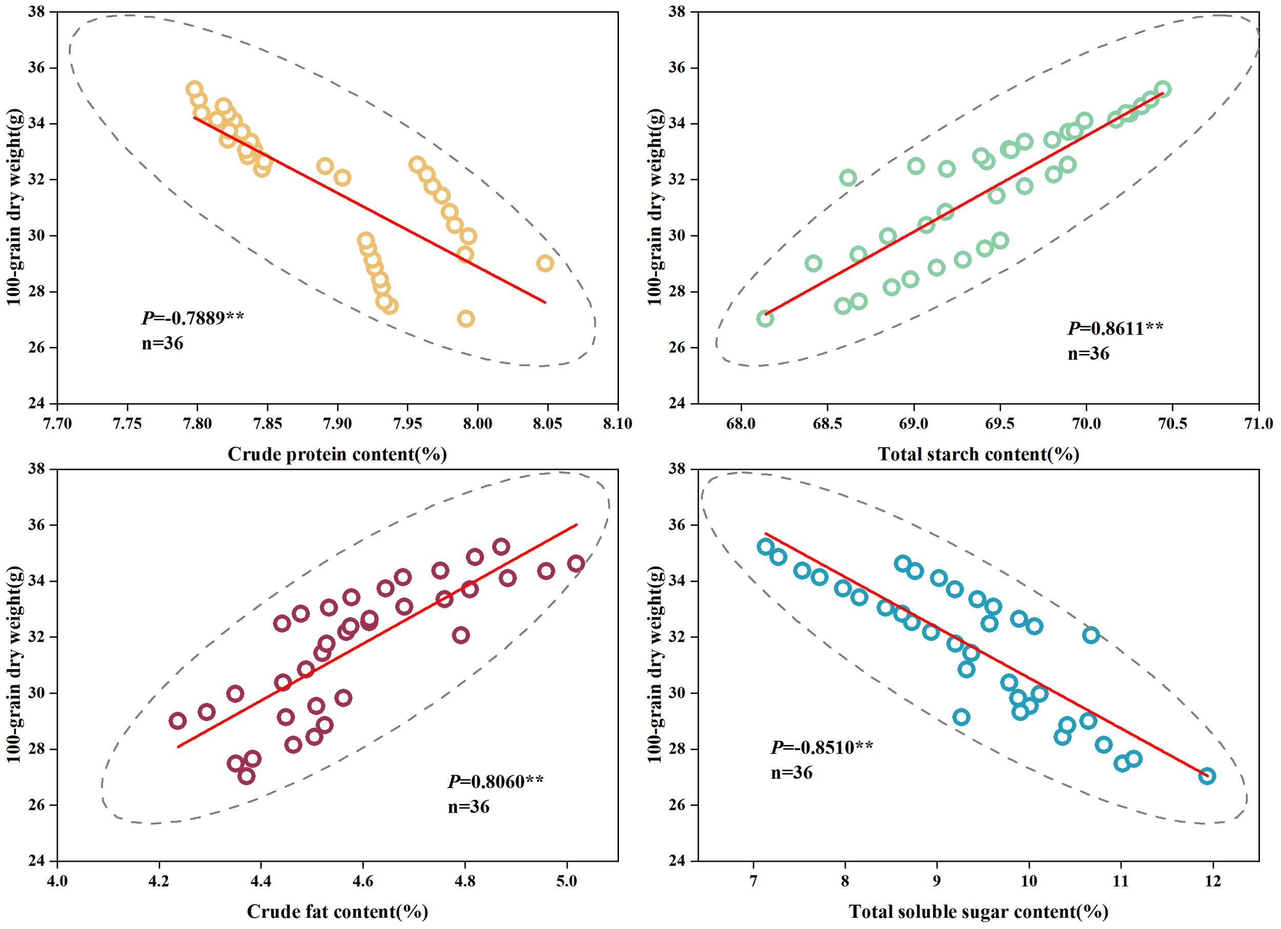 At physiological maturity, a representative cob was chosen, and the central grains of the cob were oven-dried at 105°C for 30 min, followed by drying to a constant weight at 60°C, and then crushed for measurement. The total nitrogen content of the grains was determined by employing the semi-micro Kjeldahl method, and the crude protein content was calculated by multiplying the total nitrogen content by a factor of 6.25. The determination of crude fat content utilized the Soxhlet extraction–residue method (Atif and Perveen, 2023), and the total starch and total soluble sugar content were assessed following the method described by Yu et al. (2022).