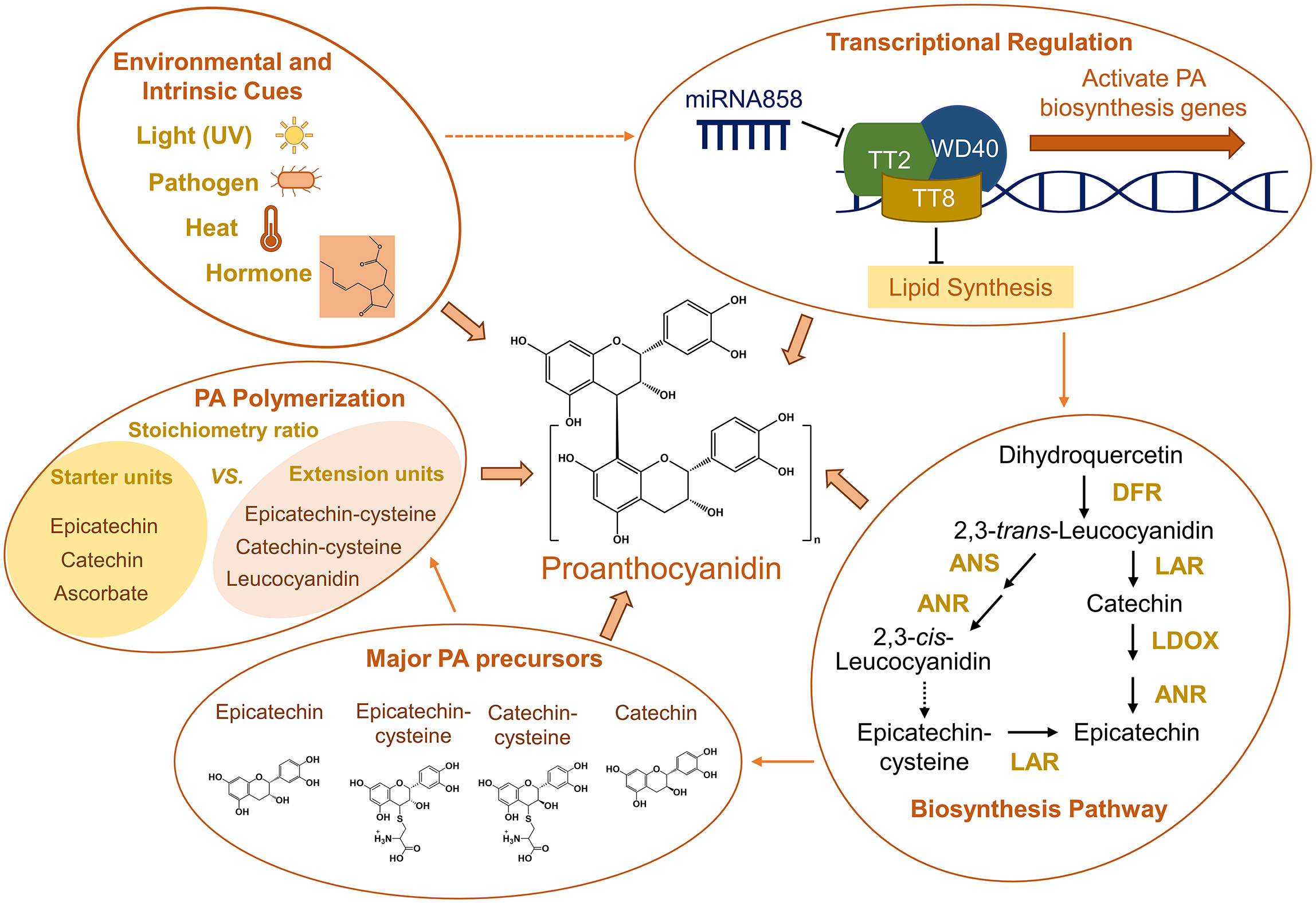 Figure 1 Summary of environmental and intrinsic cues for PA biosynthesis, transcriptional regulation of PA biosynthesis, simplified conventional PA biosynthesis pathway based on studies in Medicago, major PA precursors, and factors affecting PA polymerization. Arrows between groups indicate cause-and-effect relationships. Dashed arrows between groups and in the PA biosynthesis pathway indicate processes that remain unclear. The hormone structure in the “Environmental and Intrinsic Cues” group represents methyl jasmonate. ANR, anthocyanidin reductase; ANS, anthocyanidin synthase; DFR, dihydroflavonol-4-reductase; LAR, leucoanthocyanidin reductase; LDOX, leucoanthocyanidin dioxygenase.