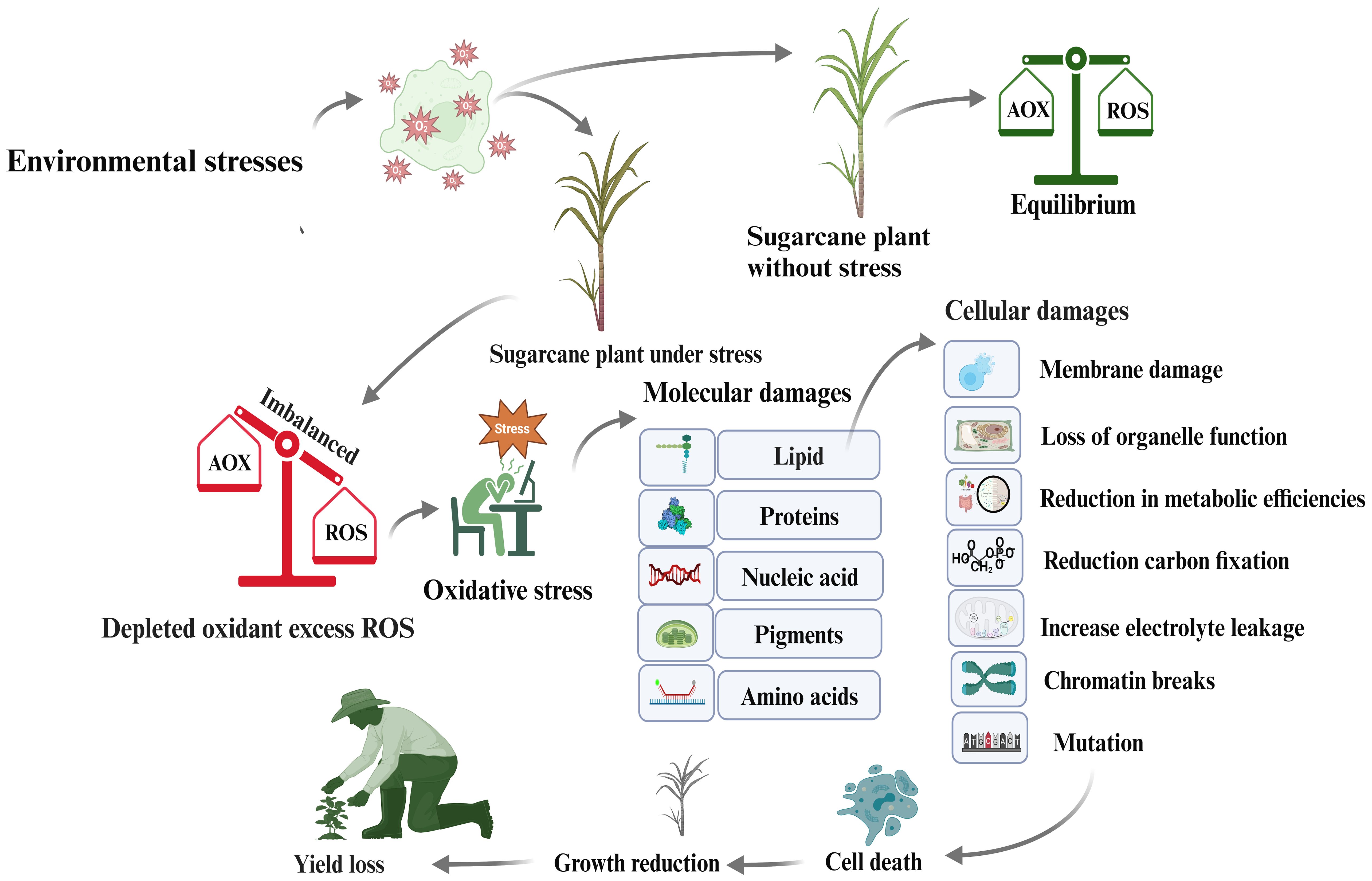 Figure 5. Mechanism of ROS accumulation in sugarcane plant cells as a consequence of oxidative stress, leading to reductions in sugar content and sugarcane yield.