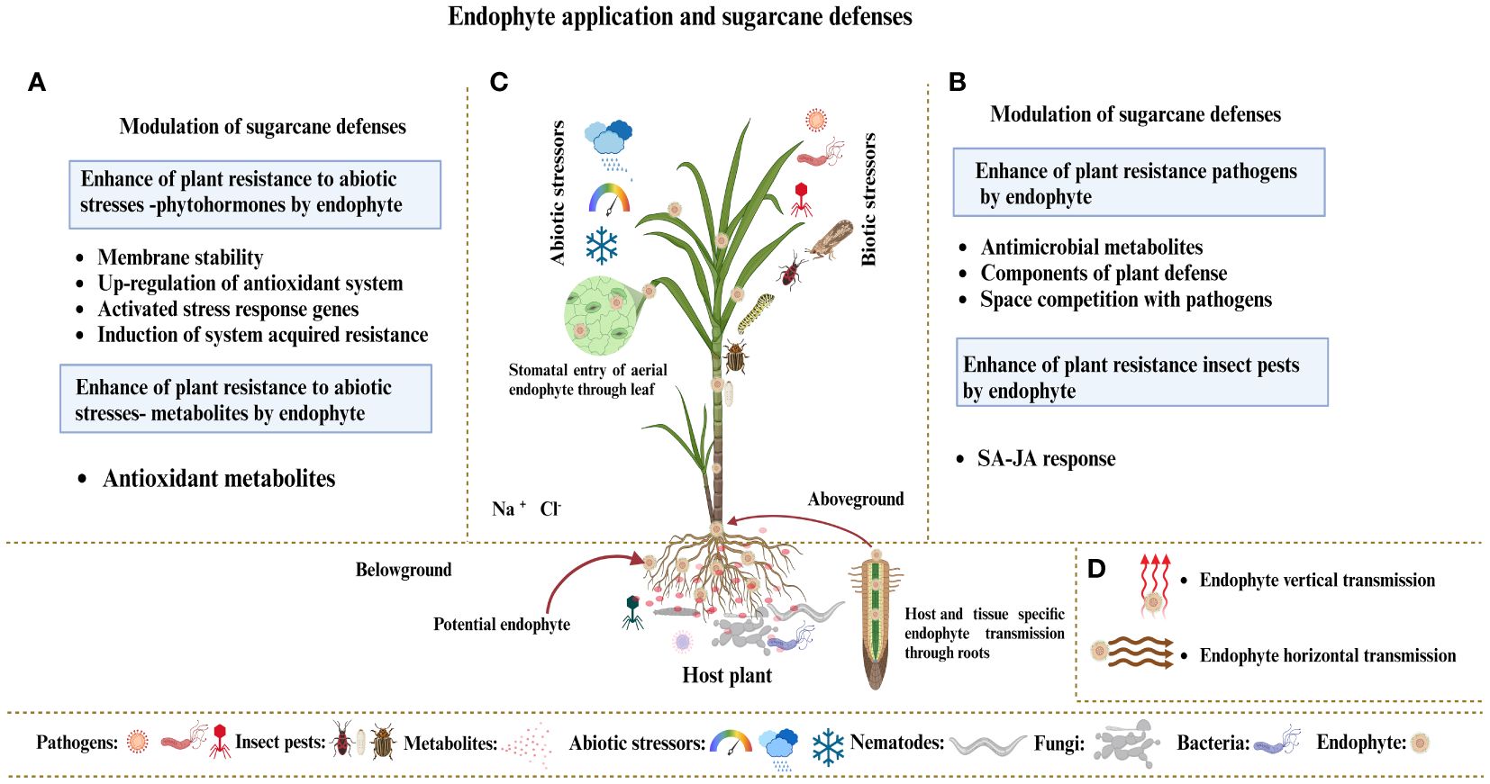 Figure 6. (A) Hypothetical model demonstrating how endophyte colonization affects sugarcane plant defenses against various abiotic stresses, such as heat, cold, humidity, salt, and drought. (B) Endophytes boost plant immunity by producing protective metabolites and modifying the phytohormone mechanism under biotic stressors, such as pathogens and insect pests. (C) Endophytes exist in various organs of plants, including leaves, stems, and roots. Endophytes enter the plant via roots, xylem tissues, and leaf stomata. (D) Endophytes typically use two transmission methods: vertical transmission from parent plants to their offspring and horizontal transmission between plants through spores, hyphal fragmentation, or biotic or abiotic dispersion agents, allowing for the spread of different host plants.