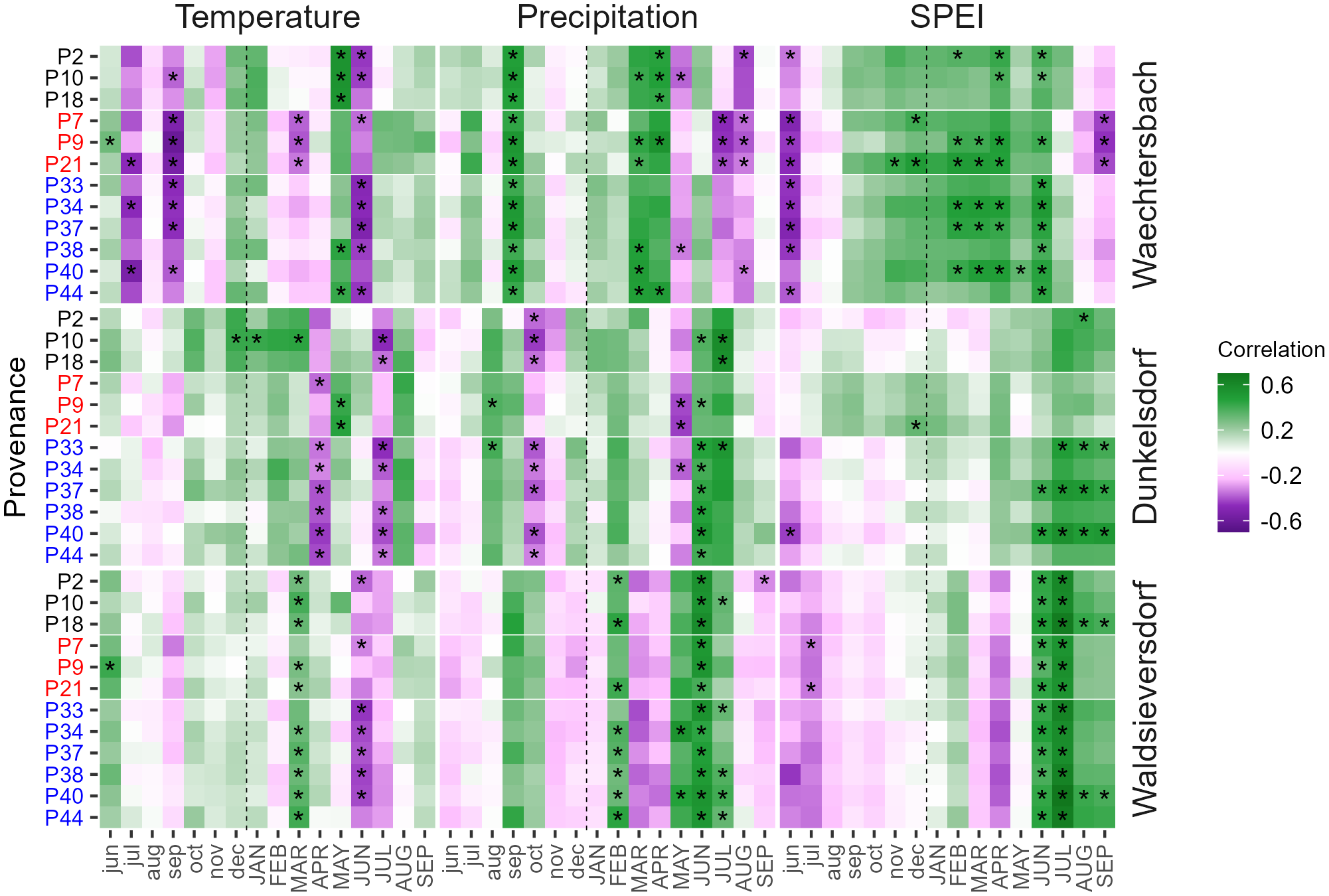 Heatmap with bootstrapped correlation coefficients between provenance chronologies (y-axis) and monthly climate data (temperature, precipitation and SPEI) from previous-year June (jun) to current-year September (SEP). Sites are arranged according to the precipitation gradient from wet (Waechtersbach) to dry (Waldsieversdorf). Correlation coefficients range from negative (violet) to positive (green) values and asterisks indicate significant correlations.