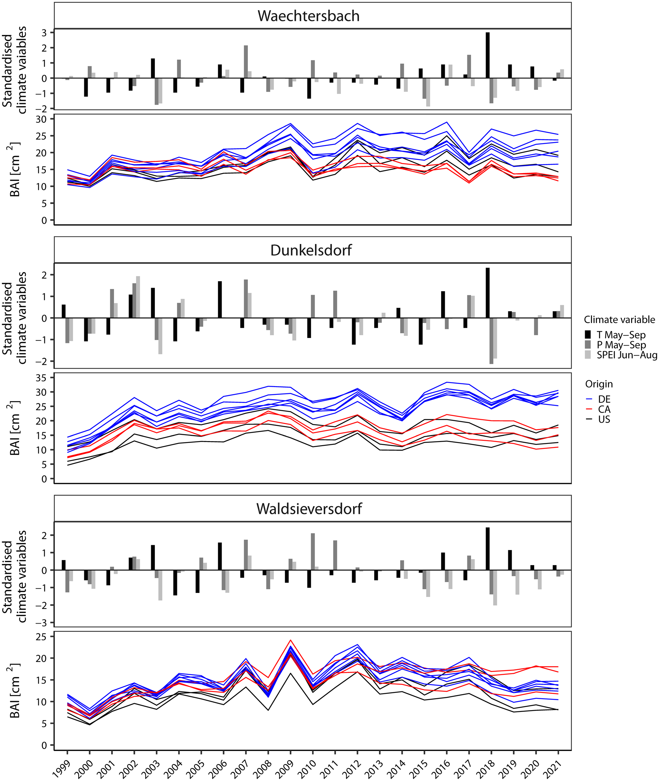 To compare the general growth performance of the provenances as well as to identify years with (and potential climatic cause of) extreme growth responses, we visually compared BAI time series with climate deviations (Figure 3). For the latter, we focused on temperature and precipitation from May to September as well as on SPEI in the summer months (June to August). Climate deviations differed between sites according to the specific climate conditions experienced revealing years with a high drought impact (e.g., 2003 and 2018) or low temperatures (e.g., 2010). The BAI series showed a comparatively constant growth pattern over the common overlap period, but the annual increment differed between sites. The highest BAI was found for provenances growing in Dunkelsdorf with a clear differentiation between German provenances and those from the natural distribution, followed by provenances in Waechtersbach, where five of the six German provenances showed the highest growth. In Waldsieversdorf, provenances had visually the most sensitive growth pattern and the overall lowest BAI, especially in the early years. Two provenances from Canada (P7 and P21) stand out with a comparable increment to the German provenances, but with a less sensitive growth pattern. The provenances from the United States had a low BAI on all three sites. Years with growth depressions varied between sites and provenances in frequency and intensity. Only in 2010, provenances on all three sites showed a negative response associated with low temperatures in the growing season. Site-specific drought years with a negative deviation in SPEI and precipitation (2003, 2015, 2018) displayed different responses in BAI series across provenances and sites.