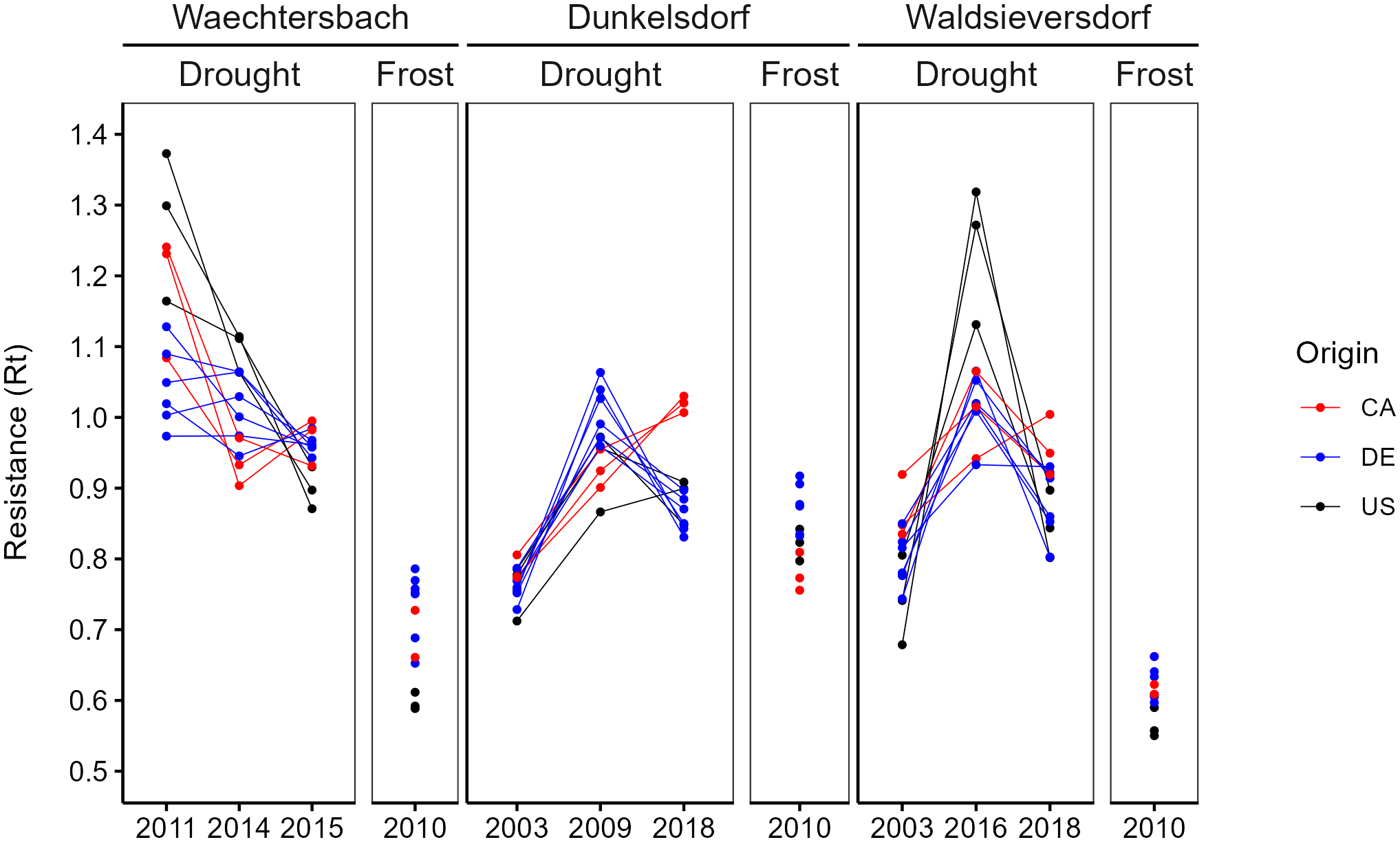 The visualization of resistance revealed a plasticity of growth responses to drought with a pronounced variation between sites, provenances and drought years (Figure 4). Within-year variation was high, with changes in provenance ranks between years. The overall highest resistance to drought was found in Waechtersbach for the severe drought years 2011 and 2014 showing resistance values > 1.0 (Supplementary Table 2), which indicates that there was no growth depression during this extreme drought. In the extreme drought year 2015, a growth depression was observed, but with lower variation in resistance between provenances. In contrast, resistance to late frost was lower and German provenances had the highest resistance. In Dunkelsdorf, the lowest resistance was found in the severe drought year 2003 with a low intra-specific variation. The response of the Canadian provenances in 2018 differed from that of their counterparts, with resistance values > 1.0. Resistance in 2010 was lower for the provenances from the natural distribution, while provenances from Germany had a higher frost hardiness. The variation between drought years was most pronounced in Waldsieversdorf. Provenances from the United States showed considerable rank changes between the drought years with no growth decrease in the extreme drought year 2016 (Supplementary Figure 6). Across drought years, resistance was lowest in the ‘severe’ drought year 2003. At this site, provenances from Germany had overall the lowest resistance to drought. Provenances in Waldsieversdorf, however, suffered most during the late frost event in 2010 resulting in the lowest resistance overall (Figure 4; Supplementary Table 2).