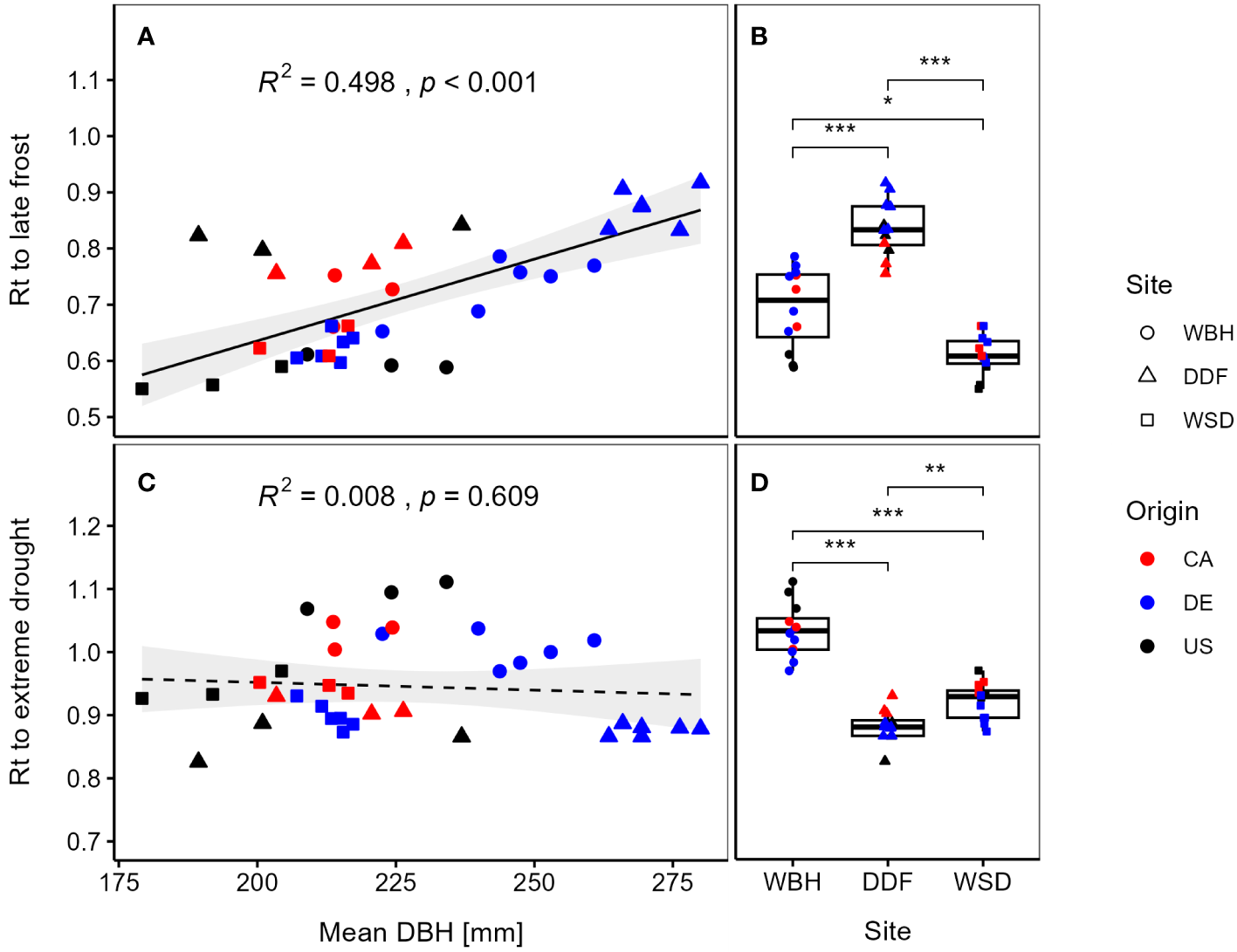 Resistance (Rt) per provenance to late frost (2010) is plotted against the mean diameter at breast height (DBH) (A) and at each site (B). In the lower panels, mean Rt for site-specific drought years is plotted against the DBH (C) and at each site (D). Point shapes refer to the three sites and line types illustrate significant (solid) or non-significant (dashed) trends. Standard errors of the means were omitted for a better visibility (presented in Supplementary Table 2). Significant differences between the site means by Kruskal-Wallis test are indicated by *p < 0.05, **p < 0.01, ***p < 0.001.