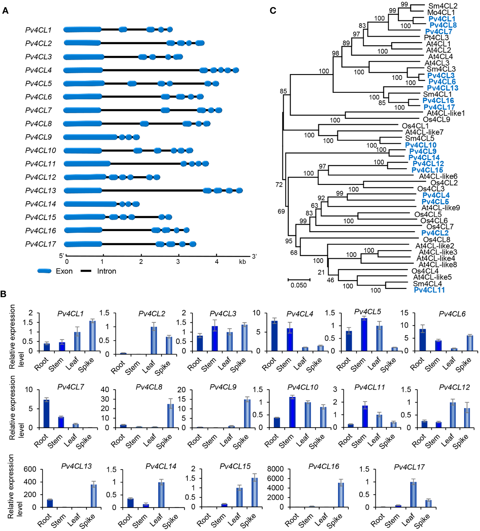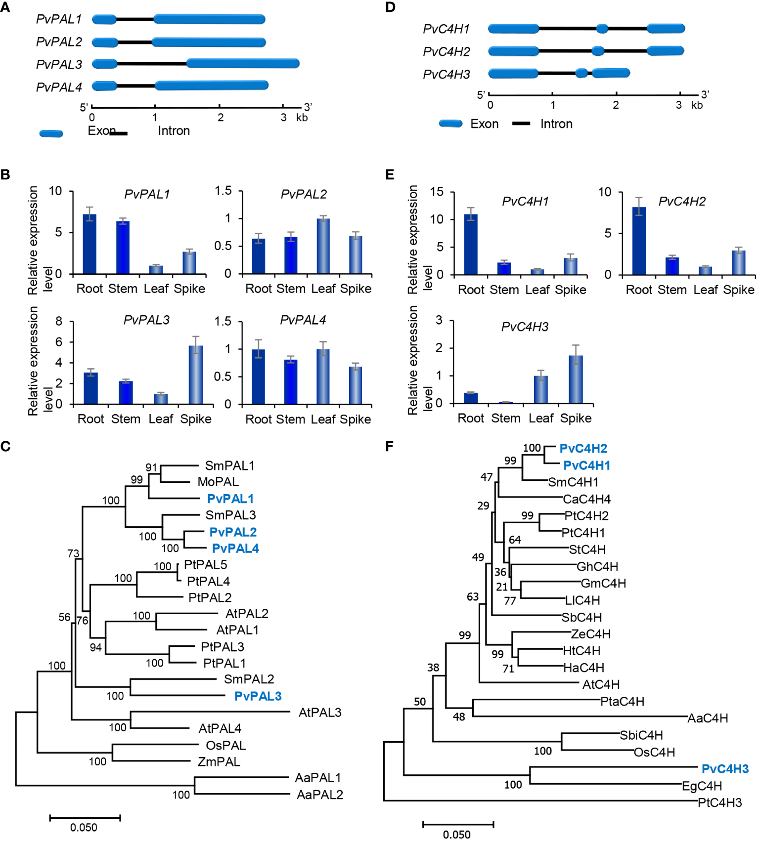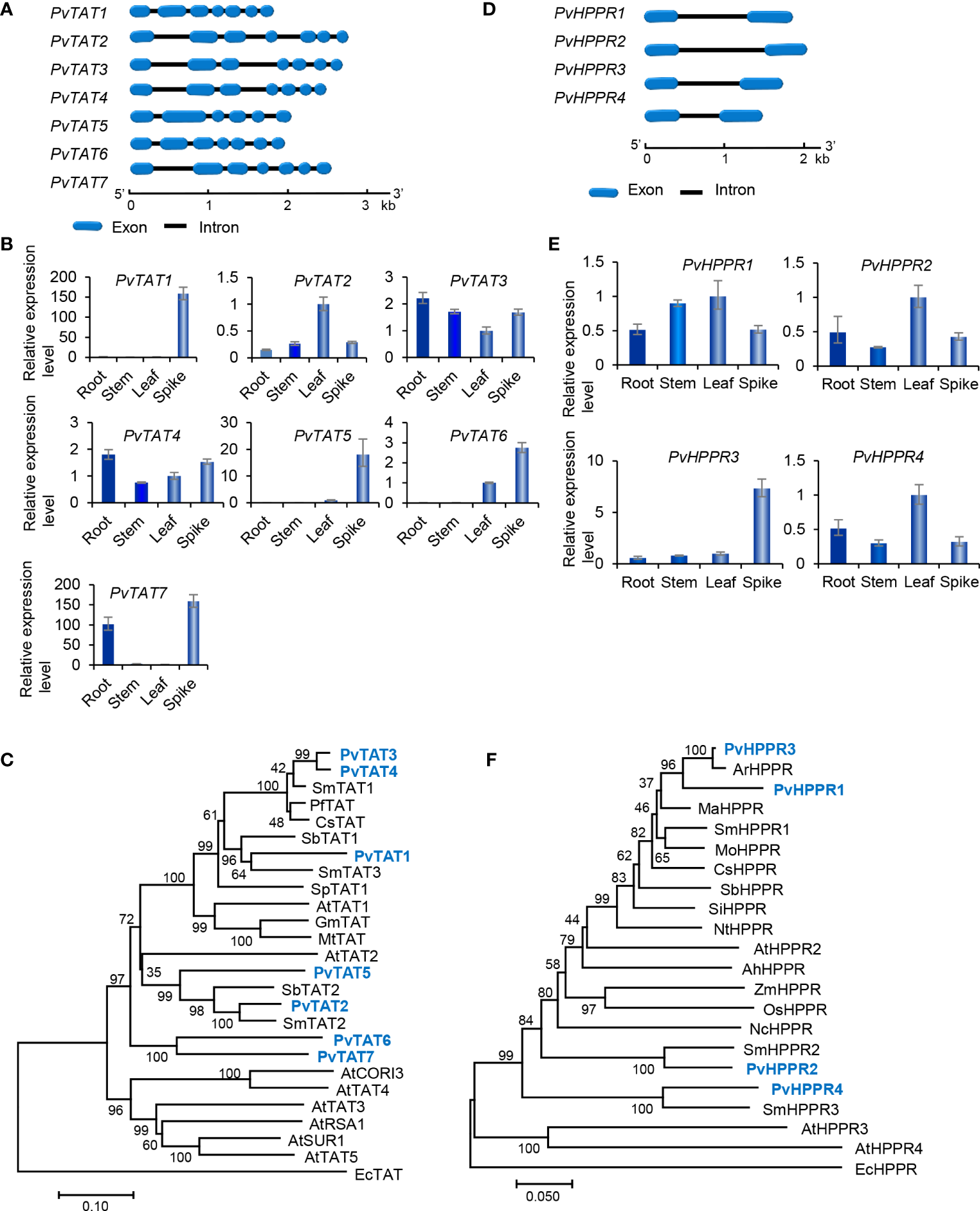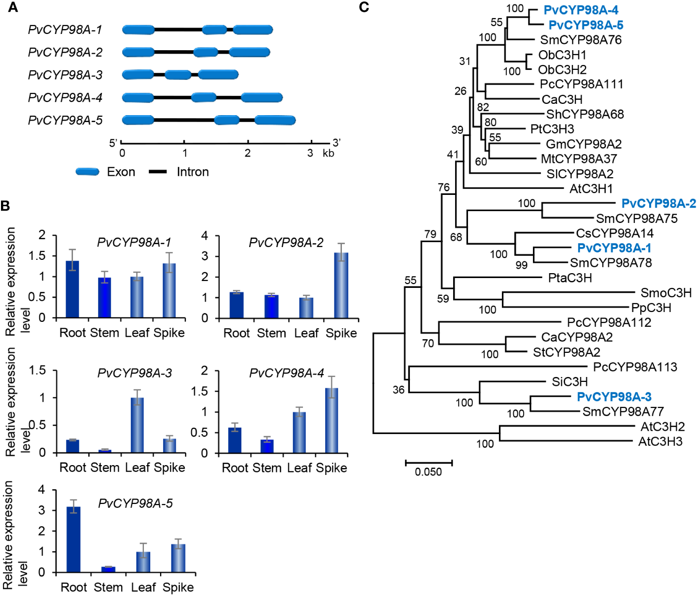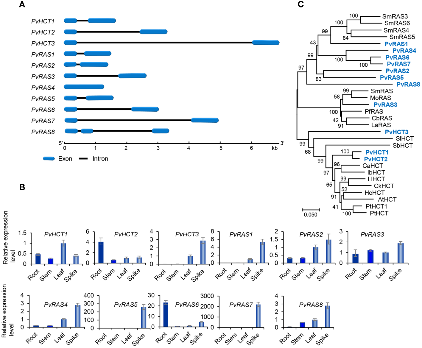 The identified genes are distributed on the 14 chromosomes of the whole genome assembly of P. vulgaris (Supplementary Figure 2) (Zhang et al., 2024). The deduced proteins have length varying from 309 to 709 amino acid residues, pI varying from 5.29 to 9.22, and molecular weight varying from 34.00 to 77.01 (Table 1). All of them do not contain transmembrane regions and were predicted to be localized in the cytoplasm, endoplasmic reticulum, peroxisome, chloroplast and mitochondrion, respectively (Table 1). The predicted localization of PvPALs, PvHCTs and PvRASs in the cytoplasm is consistent with the experimental results from tobacco, S. miltiorrhiza (Achnine et al., 2004; Di et al., 2013). The predicted localization of PvC4Hs and PvCTP98As in the endoplasmic reticulum is consistent with the experimental results from Populus, S. miltiorrhiza, and P. vulgaris (Ro et al., 2001; Di et al., 2013; Ru et al., 2017b). Pv4CLs, PvTATs and PvHPPRs were predicted to be localized in the peroxisome, chloroplast and mitochondrion, respectively. However, Peucedanum praeruptorum 4CL, P. vulgaris TAT and S. miltiorrhiza HPPR were previously found to be located in the cytoplasm (Liu et al., 2017; Wang et al., 2017; Ru et al., 2017a). Thus, the actual subcellular localization of Pv4CLs, PvTATs and PvHPPRs remain to be experimentally analyzed.