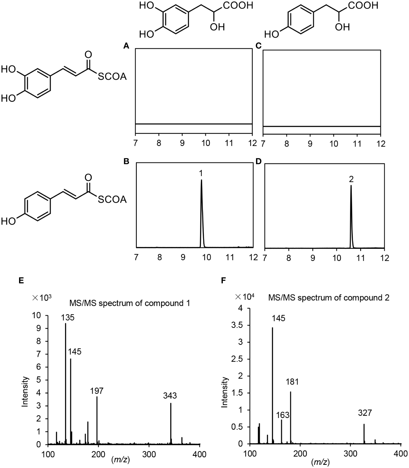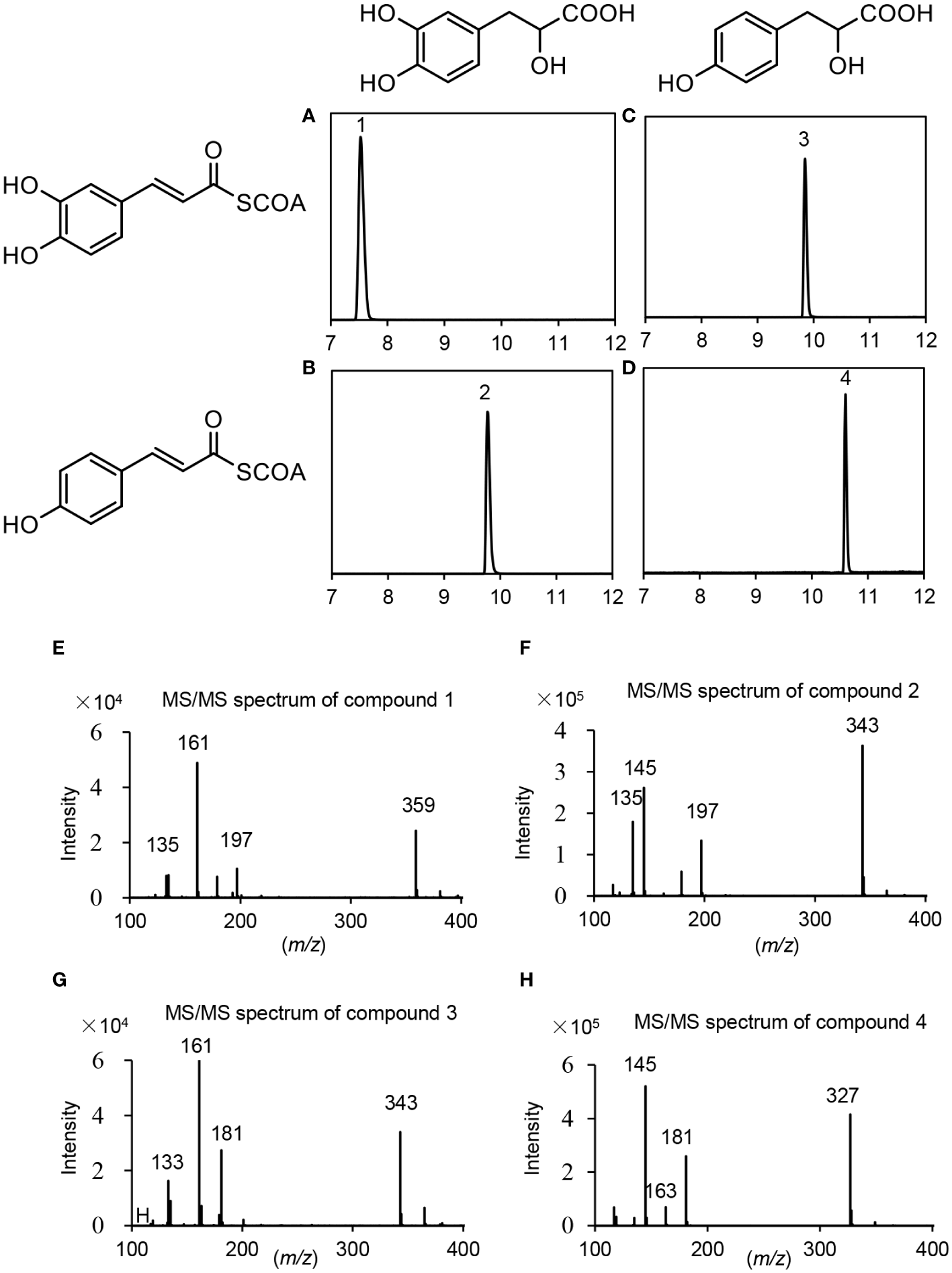 The enzymatic activity assay was carried out in a 500 µl reaction system comprising 100 µg purified proteins, 1 mM caffeoyl-CoA or p-coumaroyl-CoA as the acyl donors, 1 mM pHPL or DHPL as the acyl receptors. The reactions were incubated at 25 °C for 60 min and terminated by adding 10 µl of 10 M acetic acid. Controls were carried out using total proteins from E. coli transformed with the empty pGEX-4T-1 vector. Reaction products were collected and analyzed using ACQUITY UPLC system (Waters, Milford, MA, USA). MS/MS data were recorded on a Xevo G2-XS Q-ToF Mass Spectrometer (Waters, Milford, MA, USA) coupled to a Waters Acquity I-Class UPLC system (Waters, Milford, MA, USA). MS/MS analyses were conducted in negative-ion mode. The samples were separated on an ACQUITY UPLC BEH C18 column (1.7 μm, 100×2.1 mm) at 25°C. The mobile phase A was 0.1% (v/v) formic acid-acetonitrile. The mobile phase B was 0.1% (v/v) formic acid in water. The flow rate was 0.3 mL min−1. The mobile phases changed with the following gradient: 0–6 min, 5% A and 95% B; 6–8 min, 20% A and 80% B; 8–14 min, 21% A and 79% B; 14–18 min, 95% A and 5% B. MS was analyzed using electrospray ionization (ESI) at negative ion mode. MS-MS data were analyzed using the MssLynx V4.1 software (Waters) as described previously (Pan et al., 2023).