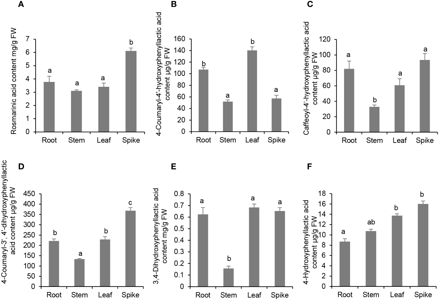 Roots, stems, leaves and spikes of two-year-old P. vulgaris were ground in liquid nitrogen. The ground samples (0.5 g) were dissolved in 10 ml of 80% ethanol and sonicated for 60 min. The extracts were collected by centrifugation and filtered using a 0.22 μm filter (Merk Millipore, USA). UPLC and LC-MS/MS analyses were performed using the ACQUITY UPLC I-Class system (Waters) as described as in vitro enzymatic activity assay of recombinant proteins. Three biological and three technological replicates were carried out for analysis of each tissue.