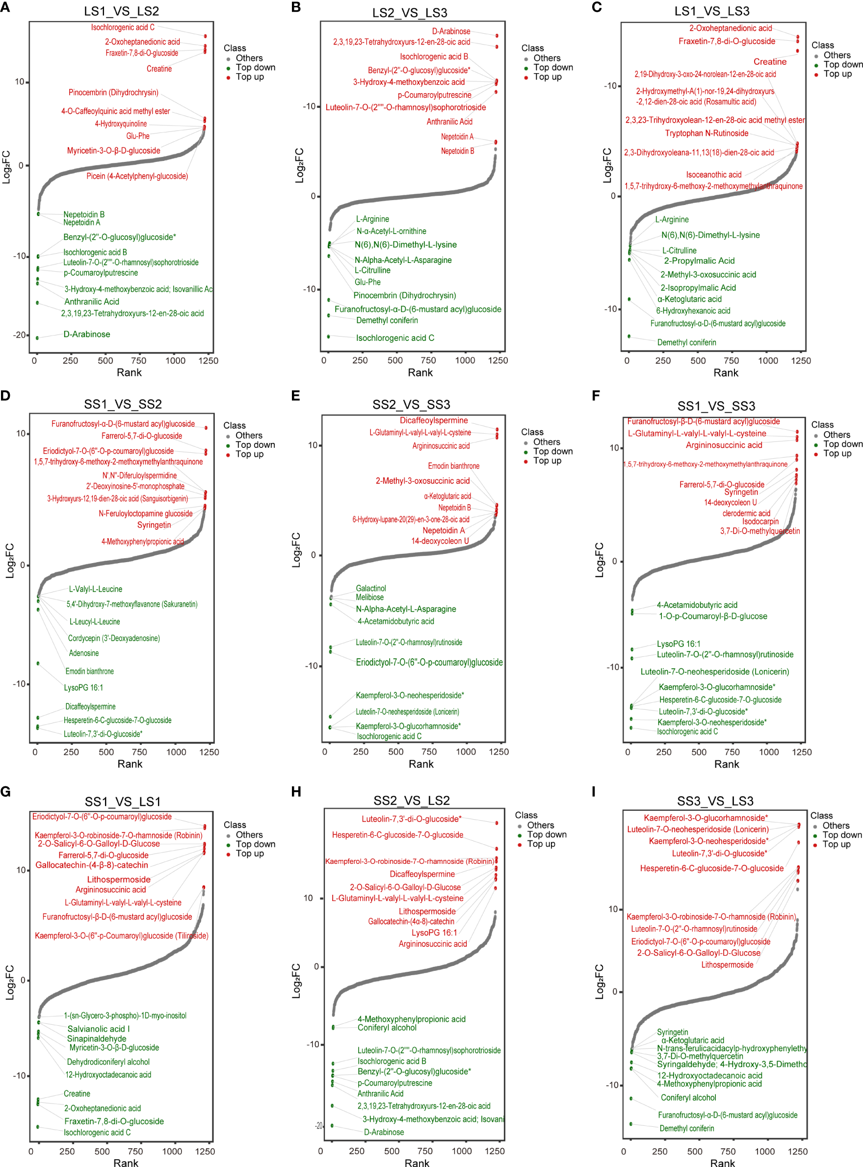 Dynamic distribution of metabolite content differences in different comparison groups. (A–C) Dynamic distribution map of differential metabolites in LS1 _ VS _ LS2, LS2 _ VS _ LS3, and LS1 _ VS _ LS3 comparison groups, respectively. (D–F) Dynamic distribution map of differential metabolites in SS1 _ VS _ SS2, SS2 _ VS _ SS3, and SS1 _ VS _ SS3 comparison groups, respectively. (G–I) Dynamic distribution map of differential metabolites in LS1 _ VS _ SS1, LS2 _ VS _ SS2, and LS3 _ VS _ SS3 comparison groups, respectively. The horizontal coordinate of the graph represented the cumulative number of substances in order of FC from smallest to largest, and the vertical coordinate represented the logarithmic value of FC with 2 as the base, and each point represented a substance. Green points represented the top 10 substances in down-regulation, and the red points represented the top 10 substances in up-regulation.