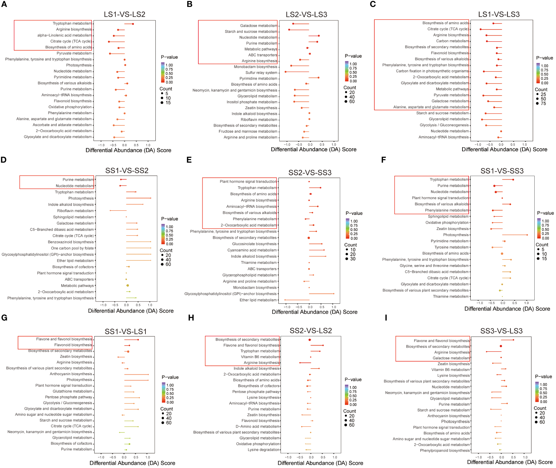 KEGG enrichment analysis in different comparison groups. (A–C) KEGG enrichment analysis of differential metabolites in LS1 _ VS _ LS2, LS2 _ VS _ LS3, and LS1 _ VS _ LS3 comparison groups, respectively. (D–F) KEGG enrichment analysis of differential metabolites in SS1 _ VS _ SS2, SS2 _ VS _ SS3, and SS1 _ VS _ SS3 comparison groups, respectively. (G–I) KEGG enrichment analysis of differential metabolites in LS1 _ VS _ SS1, LS2 _ VS _ SS2, and LS3 _ VS _ SS3 comparison groups, respectively. DA Score value greater than zero indicated that the metabolites in the pathway were generally up-regulated, and less than zero indicated that the metabolites in the pathway were generally down-regulated. The dots at the end of the line segment represented the number of metabolites.