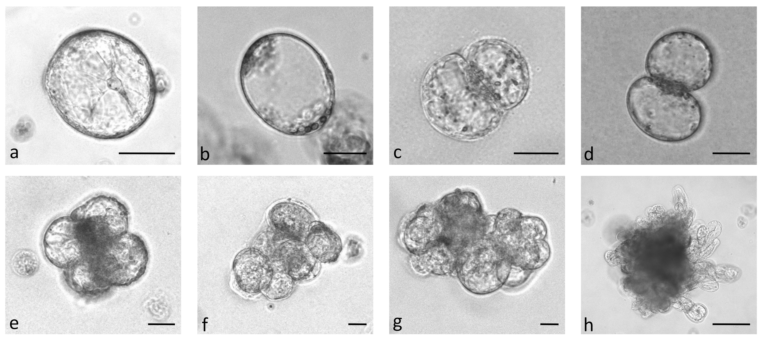 Stages of Brassica oleracea protoplast cultures: protoplasts with cytoplasmic strands (A), oval protoplasts indicating cell wall re-synthesis (B), occurrence of cell division plate (C), first division of a cell (D), multicellular structure with 4 (E), 8 (F), and more than 8 (G) cells, multicellular microcallus colony (H). Scale bars represent either 25 µm (A-G) or 200 µm (H).