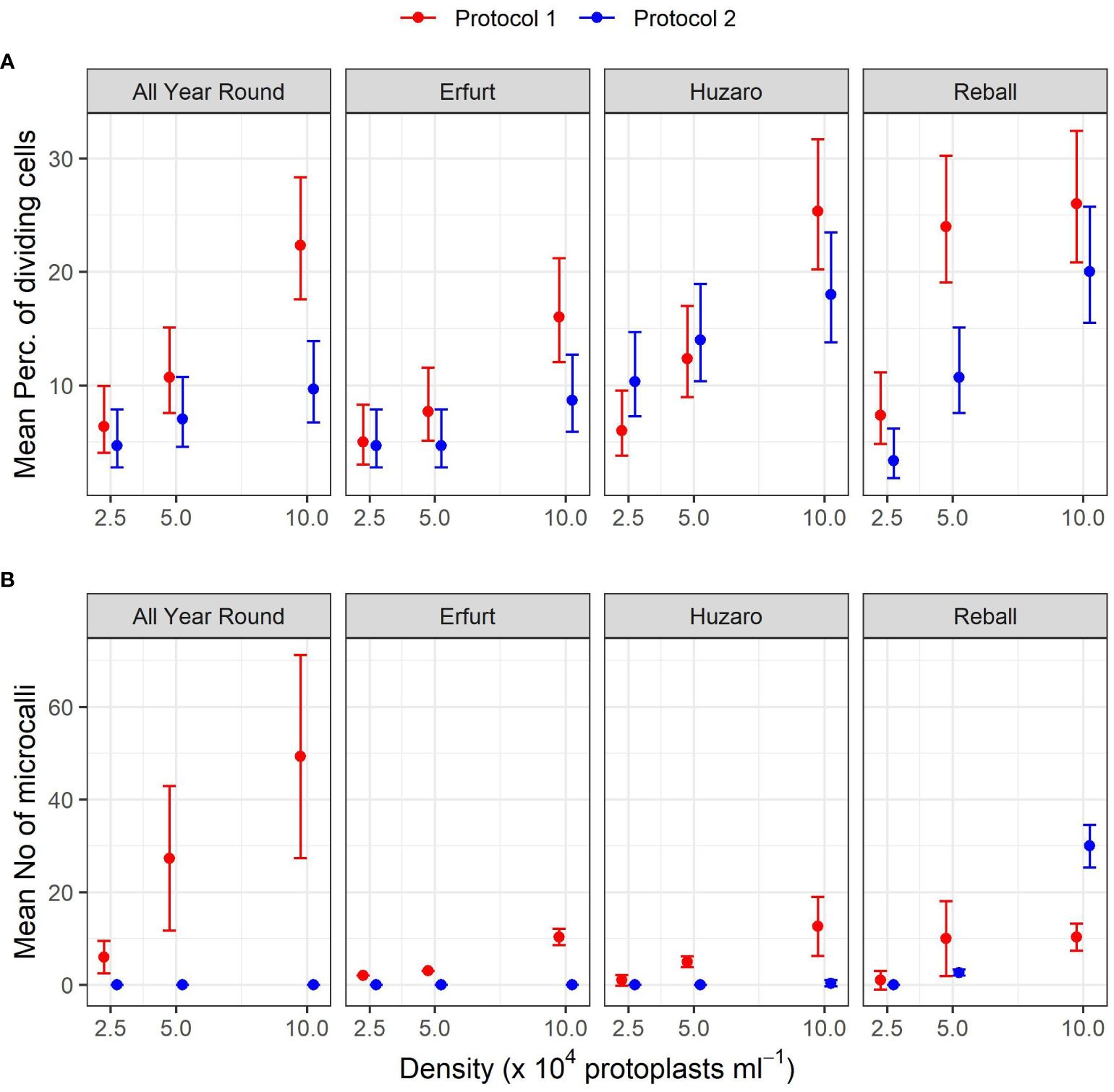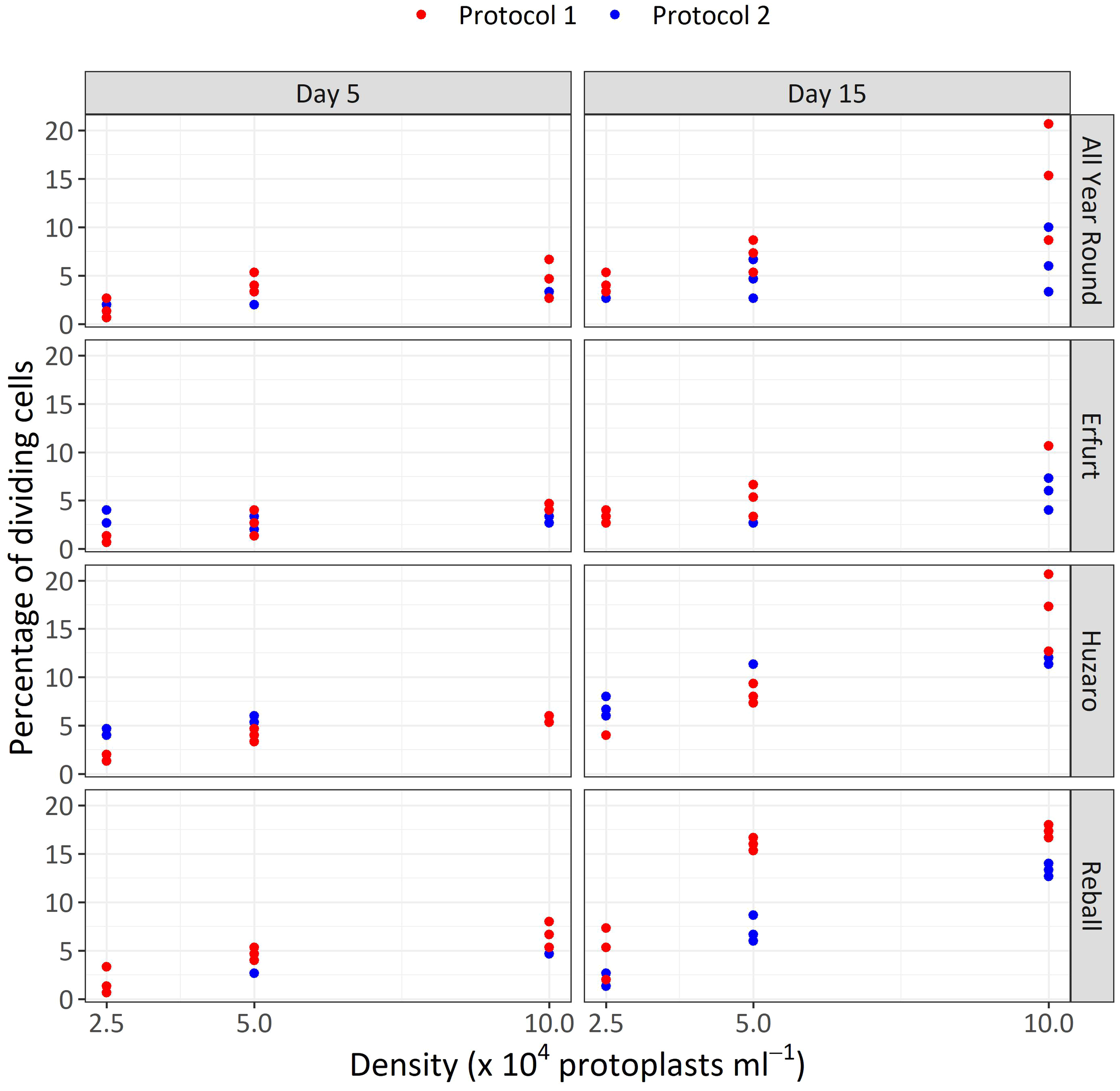 Percentages of dividing cells after 5 and 15 days of culture at three protoplasts densities (2.5, 5.0, and 10.0 x 104 pp mL-1) and under two culture protocols (Protocol 1 and Protocol 2) for four Brassica oleracea cultivars (All Year Round, Erfurt, Huzaro, Reball). Each dot represents the result of a biological replicate.