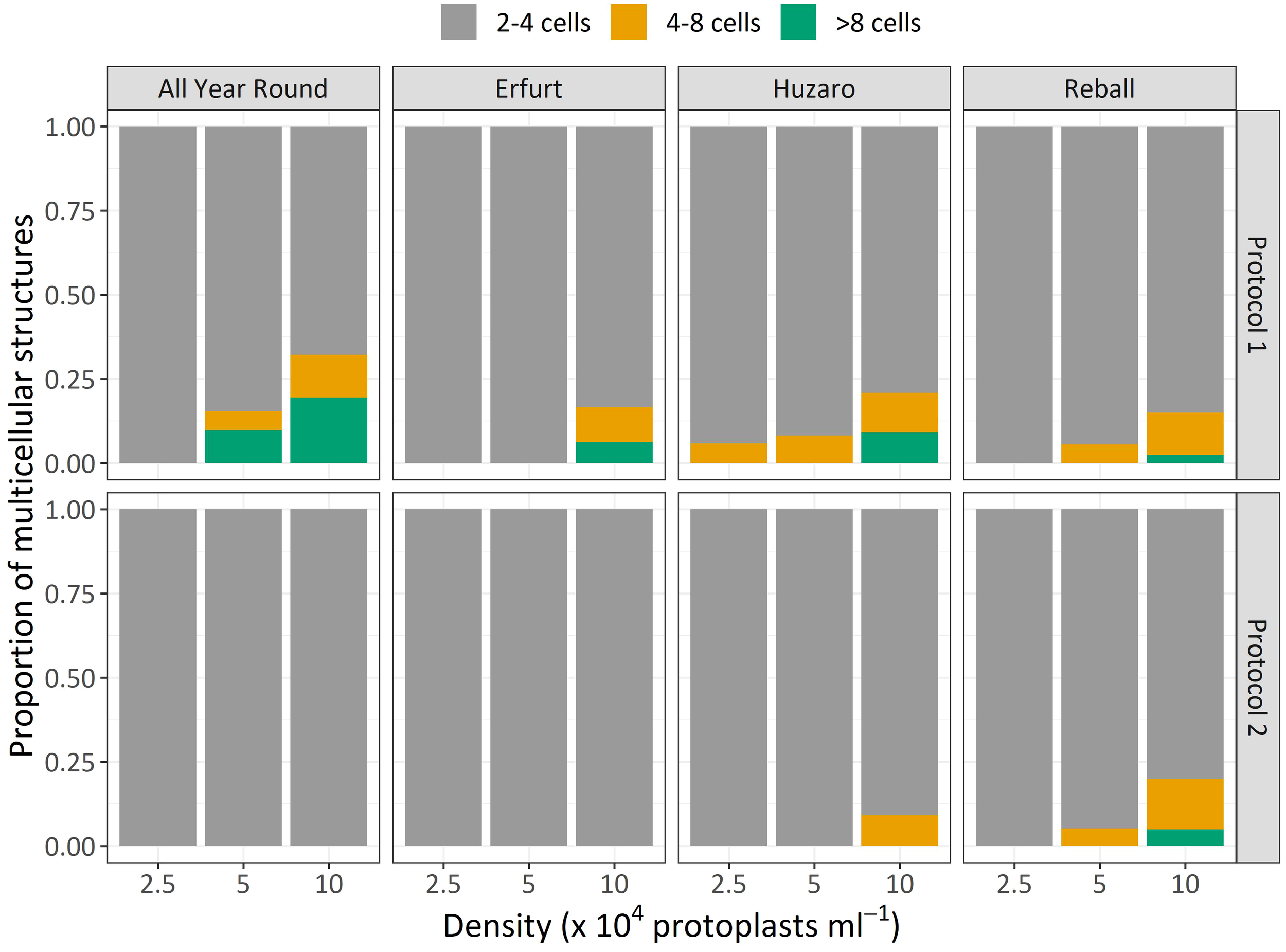 The dividing structures observed at day 15 of culture were also categorized based on the number of cells they contained as an estimation of the number of cell divisions that had occurred. Compared to the results observed on day 5, at day 15, the discs contained a higher percentage of 4–8-cell structures and multicellular structures containing more than 8 cells. As shown in Figure 5, higher proportions of structures with 4–8 cells and more than 8 cells were obtained with Protocol 1 compared to Protocol 2 for almost all cultivars and protoplast densities. The only exception was noted with cultivar Reball, which, at the highest protoplast density (10 x 104 pp mL-1), showed a slightly higher percentage of 4–8-cell (14.6%) structures and structures with more than 8 cells (5%) with Protocol 2 compared to Protocol 1 (11.5% and 3% for 4–8 cells and more than 8 cells, respectively). However, since also for Reball at the highest density, the percentage of multicellular structures with Protocol 1 (17.4%) was slightly higher than the percentage obtained with Protocol 2 (13.4%), the absolute number of structures with more than 4 cells was almost the same for Protocol 1 (3.8 per 150 protoplasts) and Protocol 2 (3.9 per 150 protoplasts). Cauliflower cultivars All Year Round and Erfurt did not form any structures with more than 4 cells under Protocol 2, irrespective of the protoplast density.