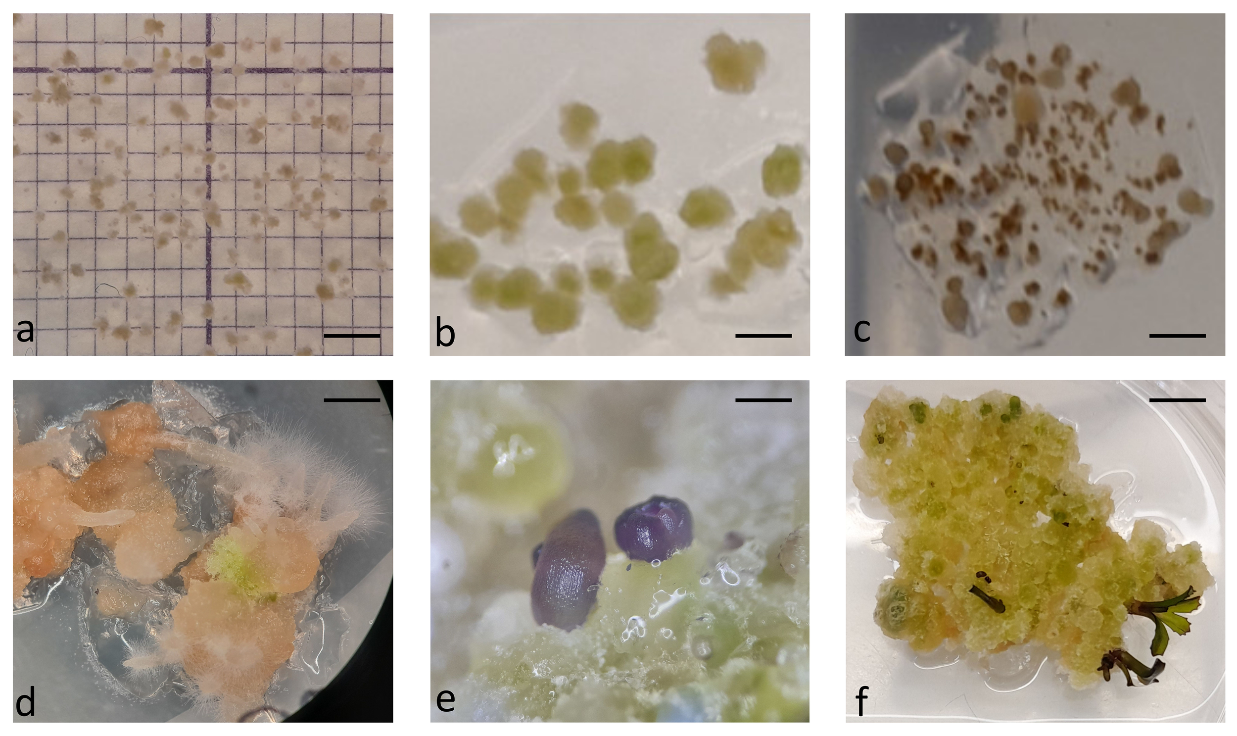 Callus development and shoot regeneration after transfer to solid medium: microcallus colonies in alginate disc at the day of transfer to solid shoot regeneration medium (A), further divisions of cells and callus growth after 2 weeks of culture on regeneration medium (B), browning of microcalli smaller than 0.5 mm (C), white proliferating callus that did not develop shoots but only roots (D), differentiation of Reball callus cells into shoot primordia after 4 weeks on regeneration medium (E), and further development of shoots after 6 weeks on regeneration medium (F). Scale bars represent either 2 mm (A-C) µm, 5 mm (D-F).