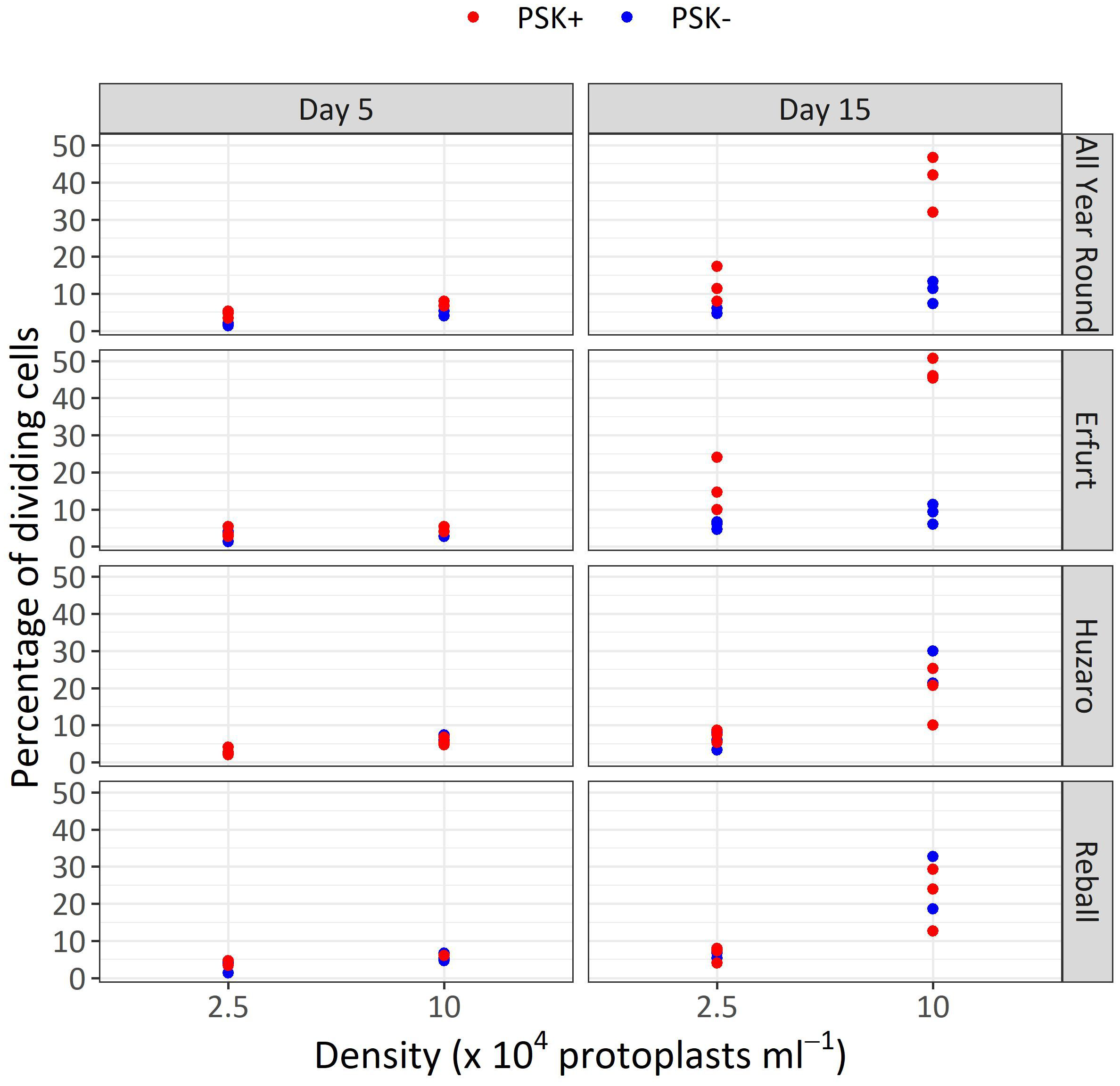 Percentages of dividing cells after 5 and 15 days of culture at two protoplasts densities. All cultures followed Protocol 1, and half of the media were supplemented with 0.1 µM PSK. Each dot represents the result of a biological replicate.