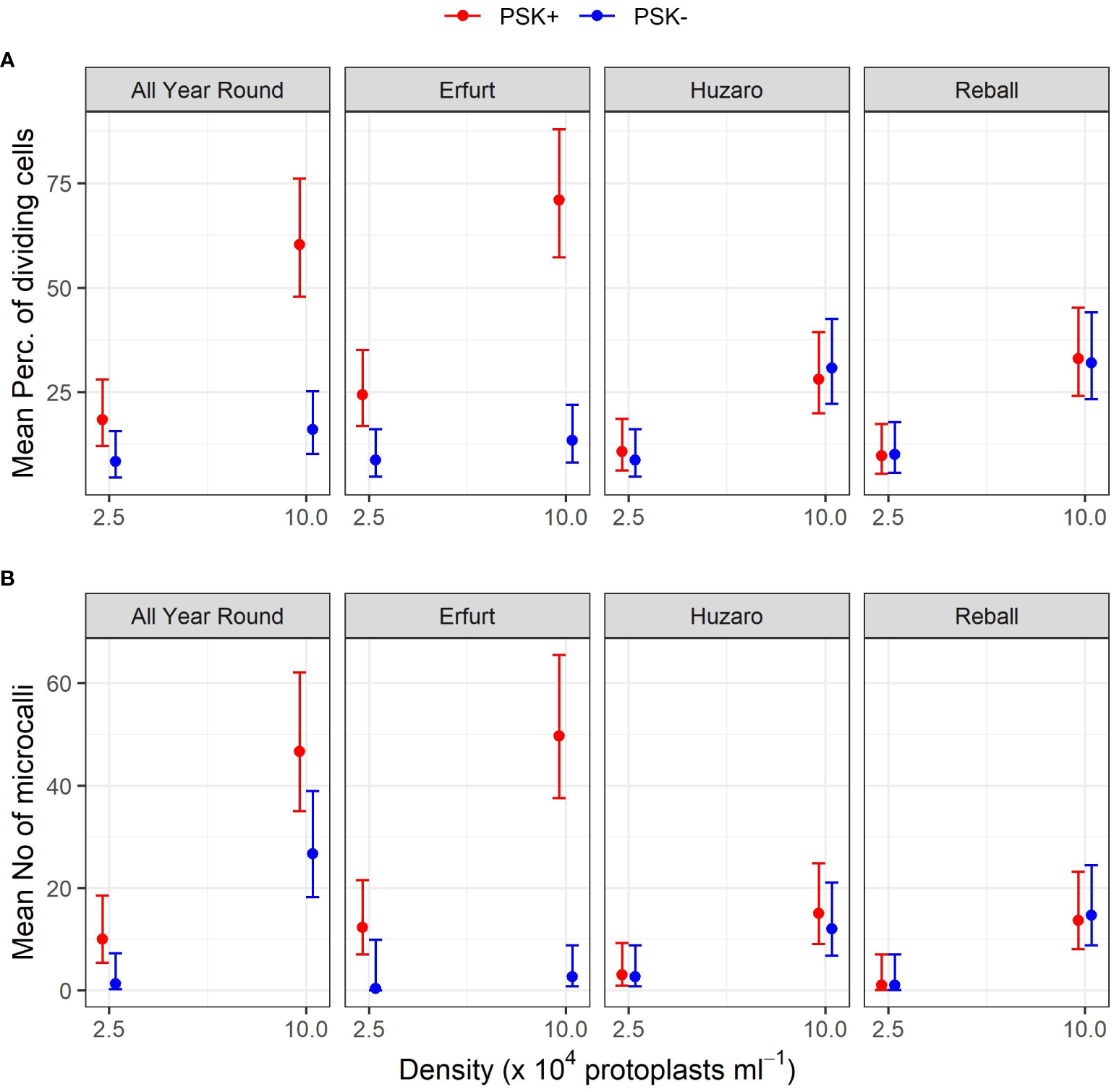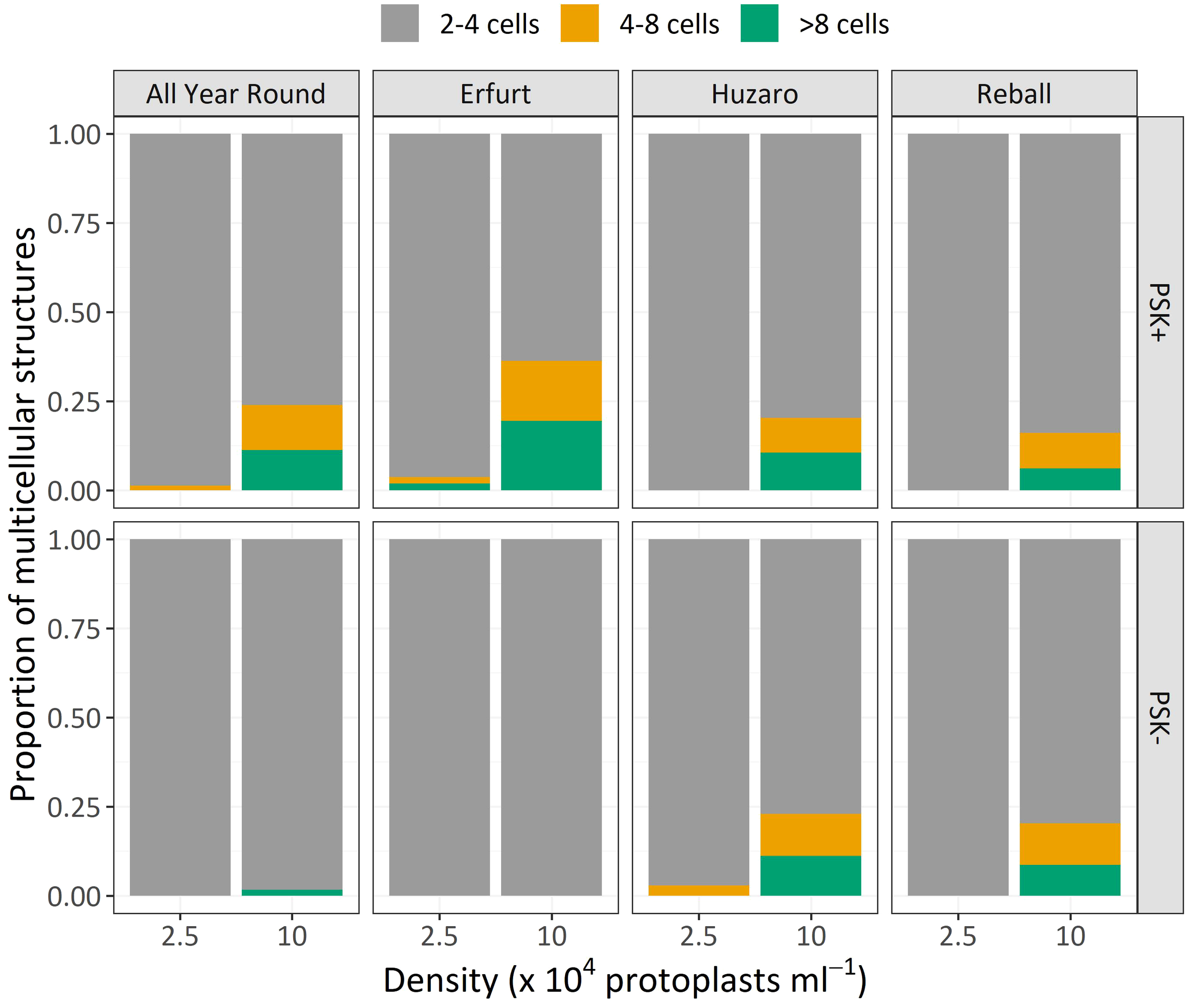 After 5 days of culture, a stimulatory effect of PSK on percentages of dividing cells was indicated, although the percentages of dividing cells of all cultivars remained low (Figure 7). Almost all multicellular structures contained 2–4 cells, and only in three treatments, some 4–8-cell structures were detected; none of the structures had more than 8 cells, similar to the findings at day 5 in Experiment 1. Considerably higher percentages of dividing cells were again observed after 15 days of culture, when the mitogenic activity of PSK increased the percentages of dividing cells in both cauliflower cultivars All Year Round and Erfurt. The PSK stimulated the division of cauliflower cells cultured at both initial protoplast densities, but the effect was more pronounced at the higher density (Figure 7; Table 3).