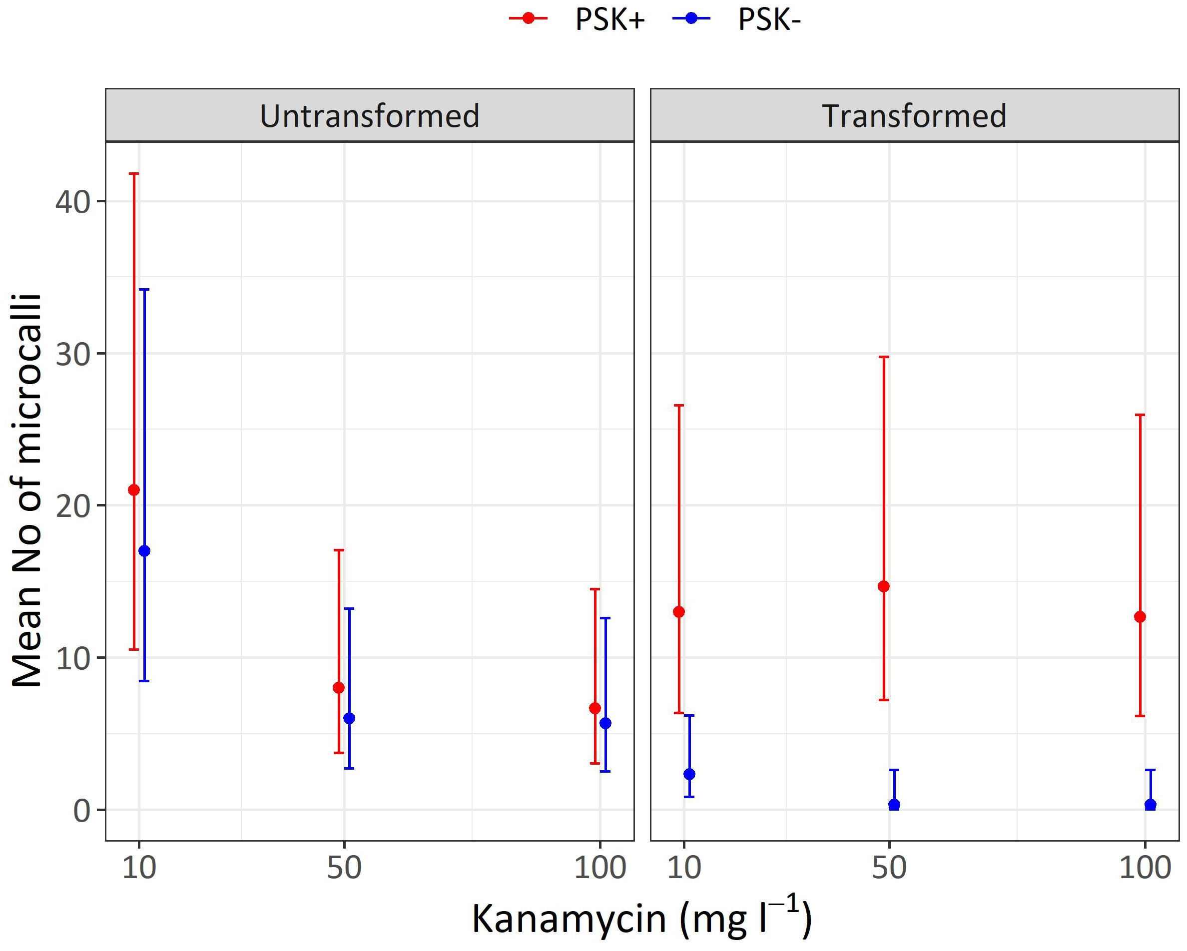 Experiment 3 was designed to evaluate whether supplementation of 0.1 µM PSK in culture medium can promote cell division of transformed protoplasts. To this end, the experiment involved culturing transformed and untransformed protoplasts at an initial immobilization density of 40 x 104 pp mL-1 under Protocol 1, with or without the addition 0.1 µM PSK. Data were recorded as the viability of transformed and untransformed protoplasts 2 days after protoplasts isolation and PEG-mediated transformation. Their ability to form microcallus colonies was evaluated 30 days after protoplast isolation and the start of culture. The experiment was performed on protoplasts of the cauliflower cultivar Erfurt, from which three discs were prepared for each treatment and each of the three biological replicates. The results were expressed as the percentages of viable protoplasts 2 days after protoplast isolation and as the mean number of microcallus colonies per alginate disc after 30 days of culture. Overall, within Experiment 3, a total of 216 discs were prepared, cultured, and analyzed.