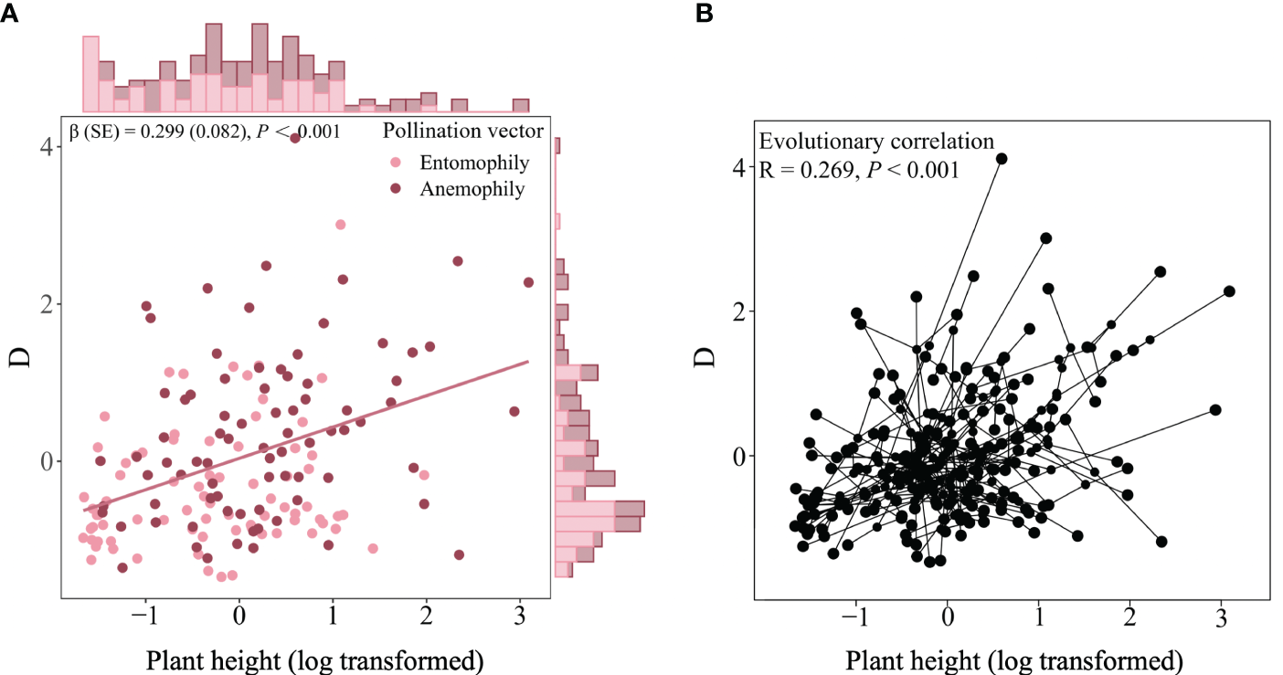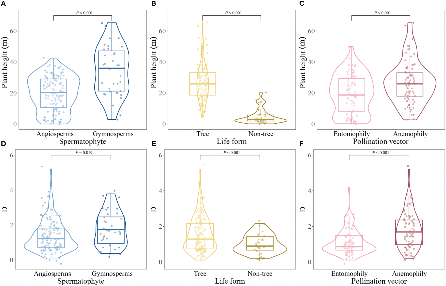 We then compiled data on adult plant height (m), life form (tree vs. non-tree), and type of Spermatophytes (angiosperms vs. gymnosperms) by searching the TRY Plant Trait Database (https://www.try-db.org/TryWeb/Home.php) (Kattge et al., 2020), BIEN database (http://bien.nceas.ucsb.edu/bien/) (Maitner et al., 2018) and published literature (e.g., Moles et al., 2009). We requested data of plant height (Trait ID 3106) from the database by registering and creating an account in July 2021. Data requested from TRY were released with a permission to free downloading 2 weeks after request. We used R BIEN to access the BIEN data. To obtain an average value of adult plant height of each species, the mean value of each species was calculated by merging all available data. Data on the pollination vectors for the species in our database were gathered from the TRY Plant Trait Database, published papers, and theses (Bawa et al., 1985; Sandor, 2012). Anemophilous plants refer to those pollinated exclusively by wind, while entomophilous plants refer to those pollinated by general insects, mainly including bees, bumble bees, butterflies, wasps, beetles, moths, and etc. We ensured that only animals associated with them were matched to each selected plant. However, in rare cases, plants pollinated by both anemophily and entomophily or by vertebrates were excluded from the dataset. We did not include life-history traits such as lifespan of plant species because of data unavailability. Information about life form (tree vs. non-tree) was added according to a look-up table of categorical plant-traits30 (https://www.try-db.org/TryWeb/Data.php#3). Overall, the final data with complete information (e.g., D, adult plant height, pollination vector, life form, and type of Spermatophytes) were restricted to the 158 plant species. All variables were prior to analysis log-transformed to correct for skewness in the trait distributions. A full list of species and data was provided in Appendix S1 of the Supplementary Material.