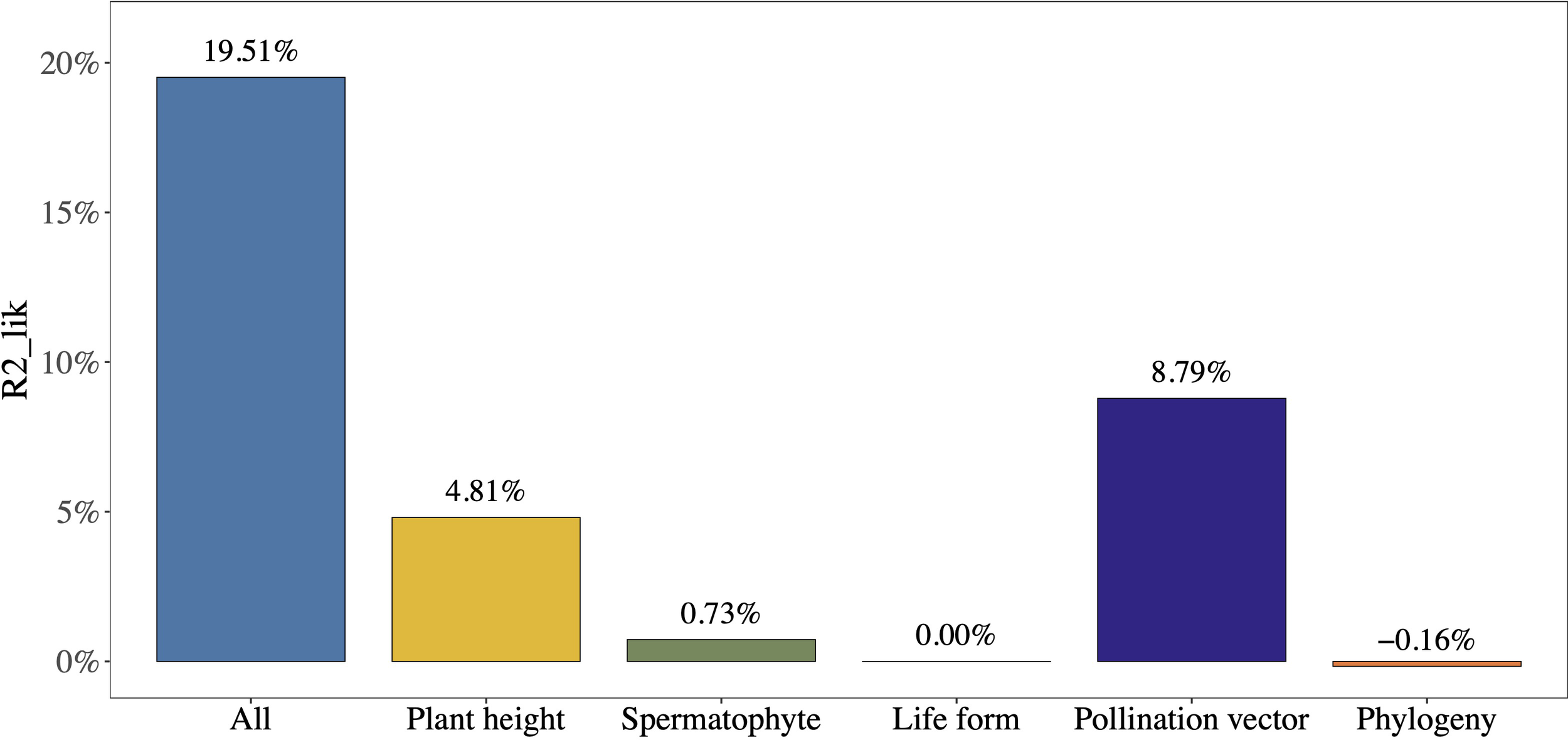 To distinguish the relative contributions of phylogeny, adult plant height, life form, pollination vectors, and type of Spermatophytes to the variation in mast seeding intensity across plant species, we used partial R2s for the logistic regression model (Ives, 2019) implemented by the R package “rr2” (Ives and Li, 2018). The partial R2lik for each factor was calculated by comparing the full model with reduced models in which a given factor was removed and measuring the consequent reduction in likelihood (Wang et al., 2022).