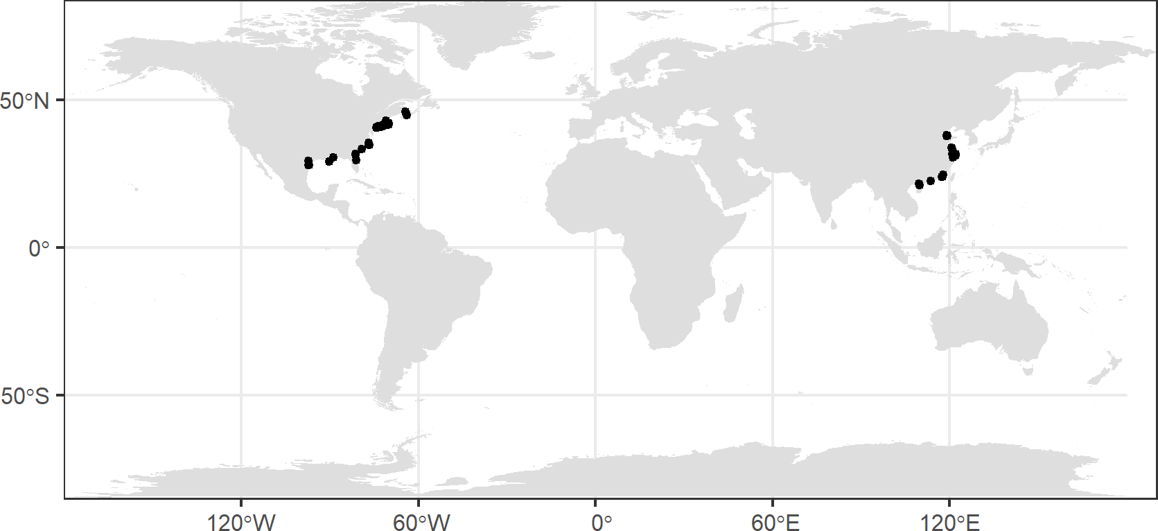 We collected climate data for each sample site from the Worldclim online repository (https://www.worldclim.org/data/index.html; Fick & Hijmans, 2017). The mean annual temperature (MAT) and mean annual precipitation (MAP) were calculated based on the extracted data from Worldclim 2.1 referencing the latitude and longitude of sample sites (Figure 2).