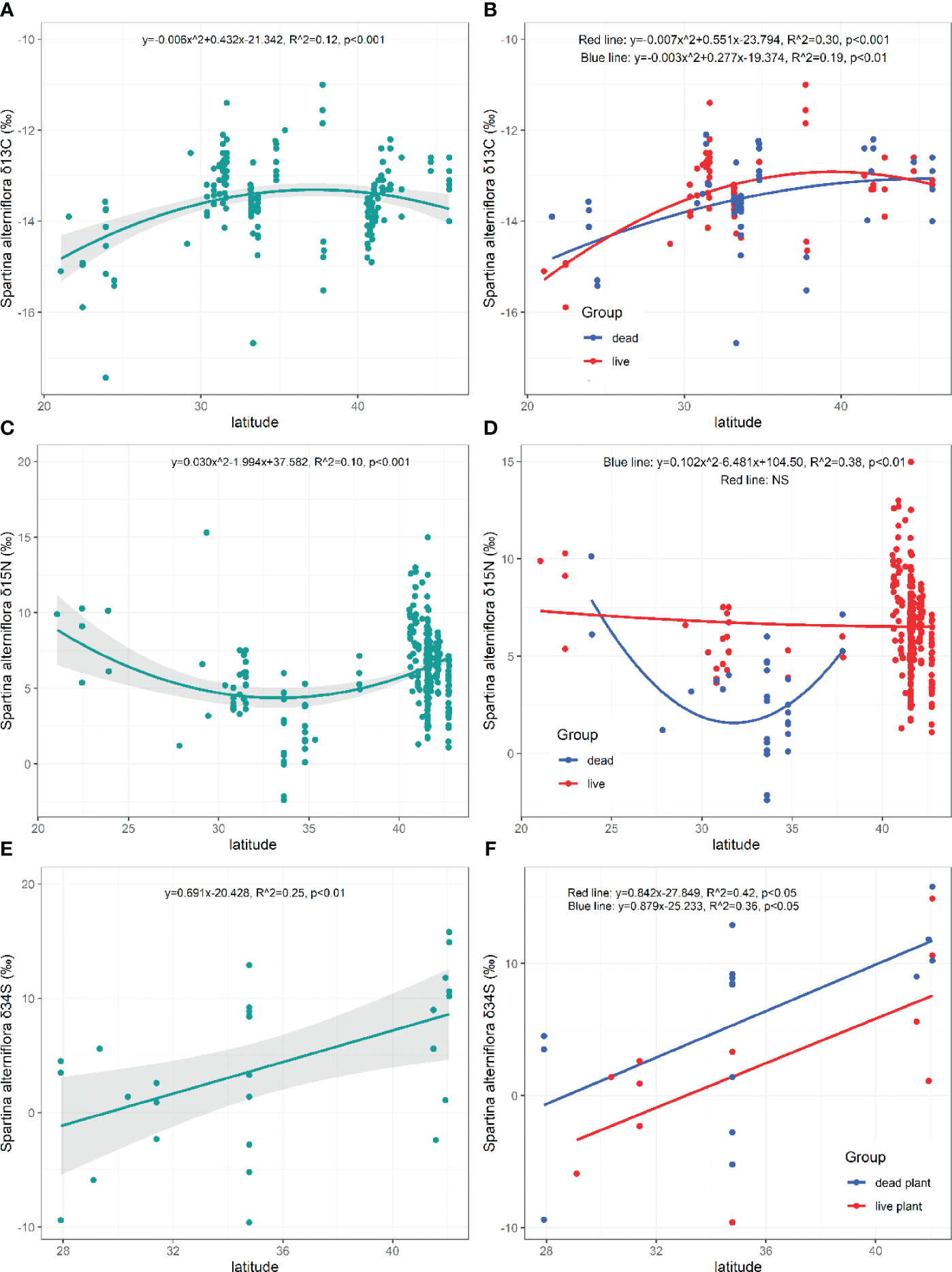 Latitudinal patterns of the of δ13C, δ15N, δ34S in live and dead S. alterniflora. NS, the fitting is not statistically significant.