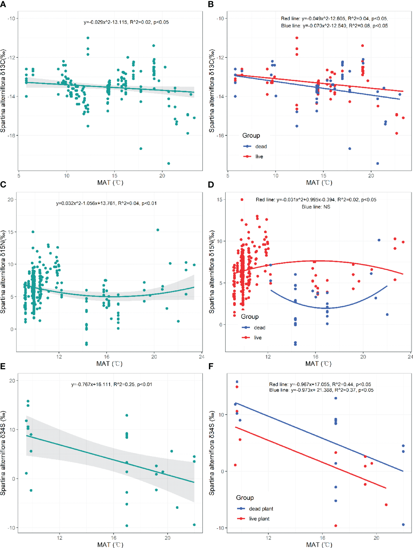 Responses of δ13C, δ15N, δ34S in live and dead S. alterniflora to mean annual temperature (MAT). NS, the fitting is not statistically significant.