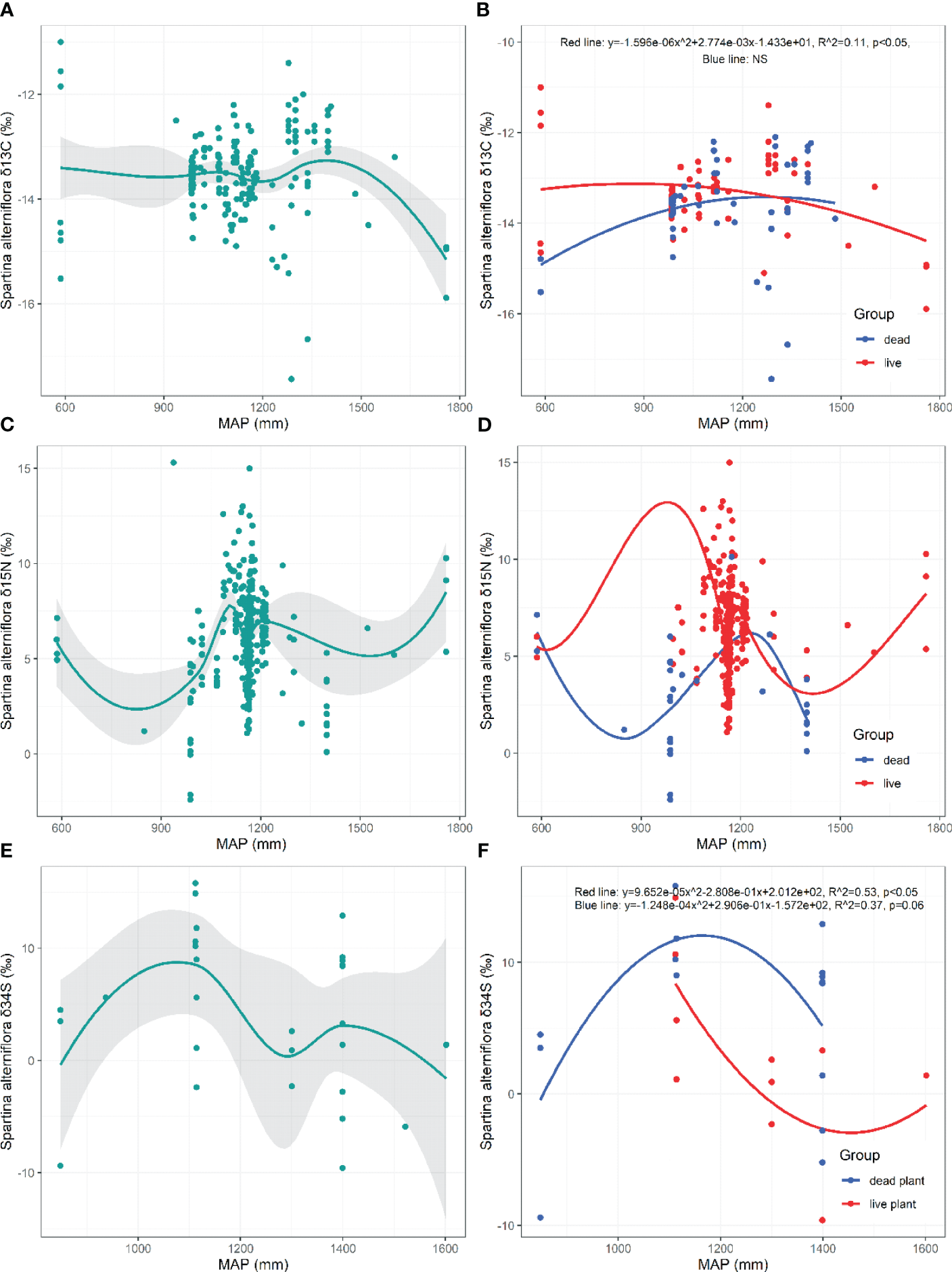 Responses of δ13C, δ15N, δ34S in live and dead S. alterniflora to mean annual precipitation (MAP). NS, the fitting is not statistically significant.