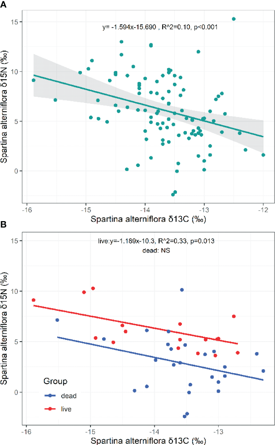 The δ15N of S. alterniflora showed a significant negative relationship with the δ13C of S. alterniflora (p=0.001, N=102; Figure 7A). Plant life status shaped a decreasing curve for the δ15N in response to increasing δ13C of S. alterniflora (Live: p=0.013, N=18, Figure 7B). However, the relationships between the δ34S and δ13C of S. alterniflora (p=0.110, N=14; Supplementary Figure S3), the δ34S and δ15N (p=0.667, N=14; Supplementary Figure S3) of S. alterniflora (or dead or live) were fuzzy.