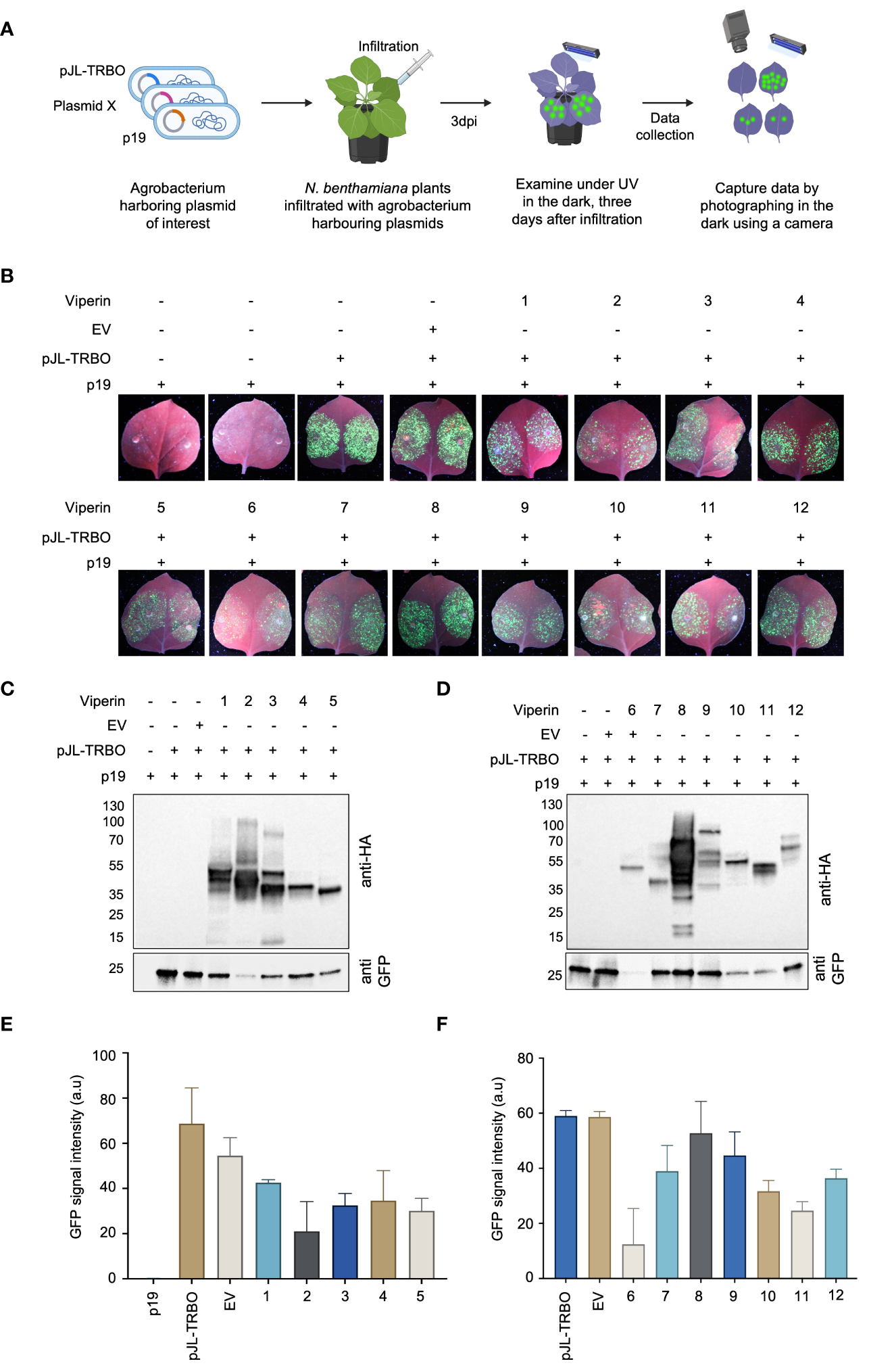 Assessment of diverse antiviral proteins for viral interference in planta (A) Schematic representation of the screening process of the selected antiviral proteins from different species. All reagents (pJL-TRBO plus Viperine) were delivered agrobacterium-mediated transiently into N.benthamiana leaves. Plants were checked for any green fluorescence three days after infiltration (3dai) under UV light, and photographs were taken in the dark with a Nikon digital camera. (B) GFP monitoring to assess the interference activity of the selected antiviral proteins in Agro-infiltrated wild-type N. benthamiana leaves in transient assays. Images were taken 3 days post-infiltration. EV represents an empty vector. (C) Western blot analysis of the abundance of the virus-expressed GFP protein to confirm the potentially identified antiviral proteins viral interference. Protein blots were developed with anti-HA antibody to detect viperin (upper panel) and anti-GFP antibody (lower panel) to detect the viral abundance due to viperine activity. The gel shows viperine proteins from 1 to 5. (D) The gel image shows the antiviral activity of potential viperin proteins from 6 to 12. The rest of the description remains the same as panel (C). (E) Graphical representation of the quantification of the GFP abundance for protein 1 to 5. The intensity of the GFP-band was measured using image J and the values were plotted in Prism. Error bars indicate SEM (n = 3). (F) Graphical representation of the quantification of the GFP abundance for protein 1 to 6. The intensity of the GFP-band was measured using image J, and the values were plotted in Prism. Error bars indicate SEM (n = 3).