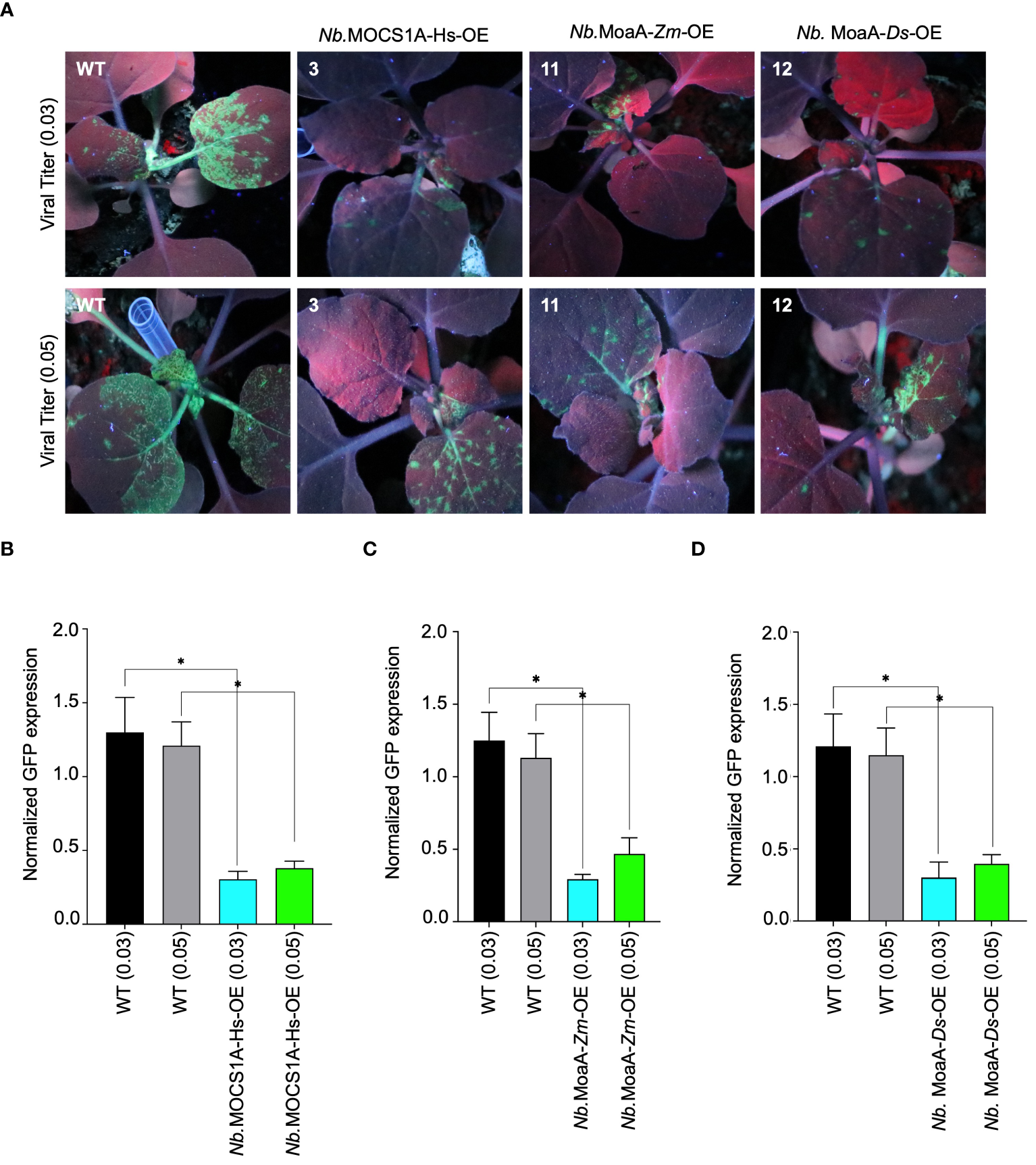 We then chose the potyvirus turnip mosaic virus (TuMV) as our target RNA virus and evaluated its pathogenicity on our stable plant lines. T2-generation data revealed varying interference levels among the tested lines challenged with TuMV-GFP (Supplementary Figure 3). Notably, N. benthamiana lines overexpressing molybdenum cofactor biosynthesis protein A (MOCS1A) from Homo sapiens, GTP 3’,8-cyclase (MoaA) from Zostera marina and Dunaliella Salina exhibited interference against TuMV-GFP. The identified resistant lines were then challenged with two TuMV-GFP titers (0.03 and 0.05 OD, based on the OD600 of the TuMV-carrying Agrobacteria used for inoculation). The results confirmed the resistance of these lines, as indicated by the reduced GFP fluorescence signal compared to the non-transgenic line (Figure 3A). RT-qPCR further confirmed the accumulation of less TuMV-GFP genomic RNA in the transgenic lines (Figures 3B–D). Additionally, a difference compared to the control was observed even when the viral titer was increased to 0.05, further confirming the resistance of these lines against TuMV-GFP.