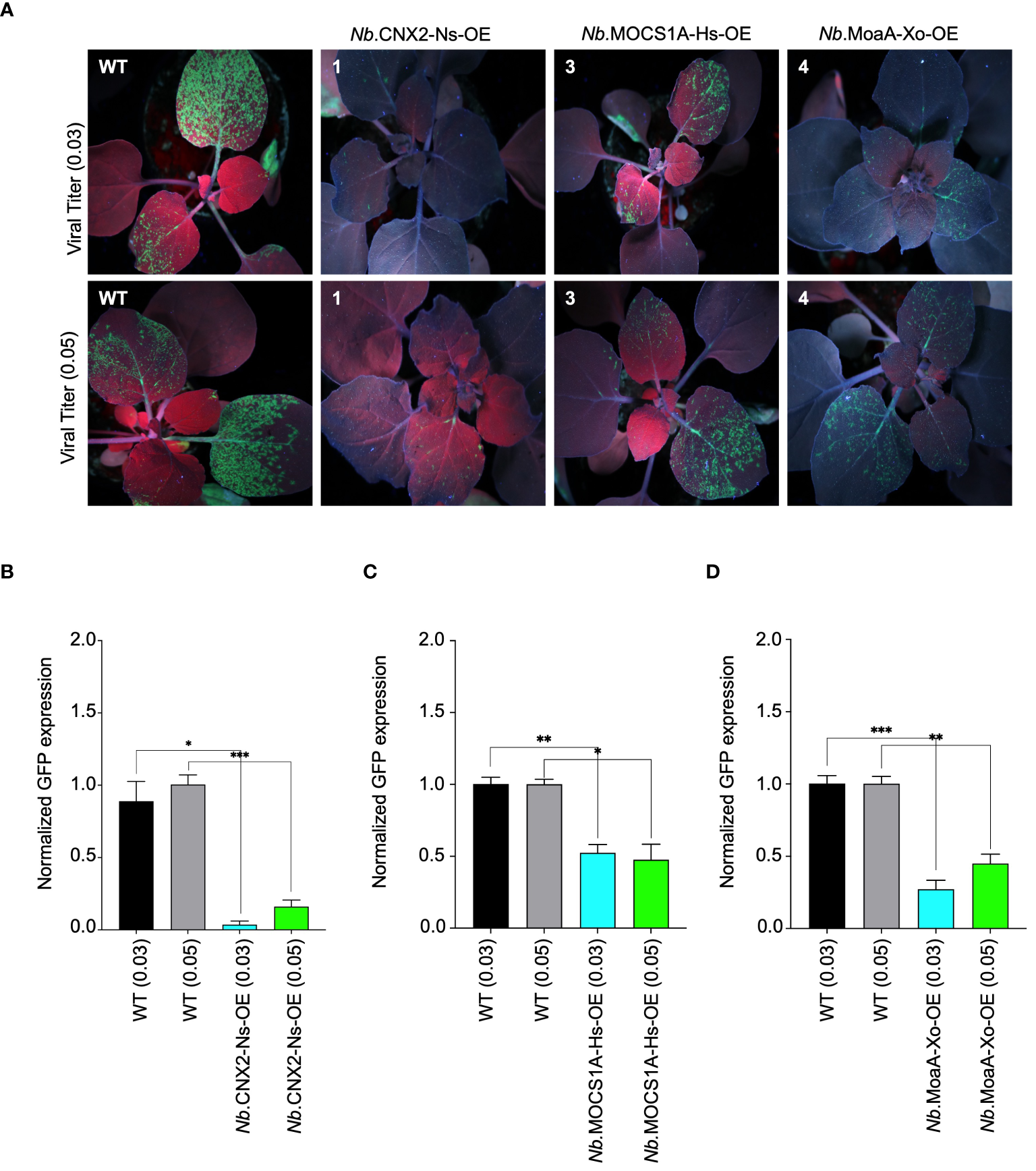 Antiviral role of molybdenum cofactor biosynthetic enzyme from different species against PVX-GFP in N. benthamiana plants stable lines. (A) Interference of PVX-GFP by radical SAM proteins expressed in tobacco transgenic lines. Stably transformed N. benthamiana lines expressing Viperin-like proteins were agroinfiltrated with two viral titer (OD 0.03 and 0.05) of PVX-GFP virus. Plants were imaged for GFP fluorescence to examine PVX-GFP systematic spread under UV light in the dark 5 to 7 days post infiltration. The N. benthamiana plants Nb.CNX2-Ns-OE overexpresses CNX2 from Nicotiana Sylvesteris, Nb.MOCS1A-Hs-OE overexpresses MOCS1A from Homo sapiens, and Nb.MoaA-Zm-OE overexpresses MoaA from Xanothomonas oryzae.(B) RT-qPCR analysis to quantify PVX-GFP RNA in cPMP-synthase overexpressing N.benthamiana plants. For each protein, the interference efficiency is shown compared to the controls. (C) RT-qPCR analysis to quantify PVX-GFP RNA in MOCS1 overexpressing N.benthamiana plants. For each protein, the interference efficiency is shown compared to the controls. (D) RT-qPCR analysis to quantify PVX-GFP RNA in MoaA overexpressing N.benthamiana plants. For each protein, the interference efficiency is shown compared to the controls. The Student’s t-test analysis indicated a significant difference compared with the WT (*P<0.05, **P<0.001, ***P<0.0009). Values are the means of three biological repeats.