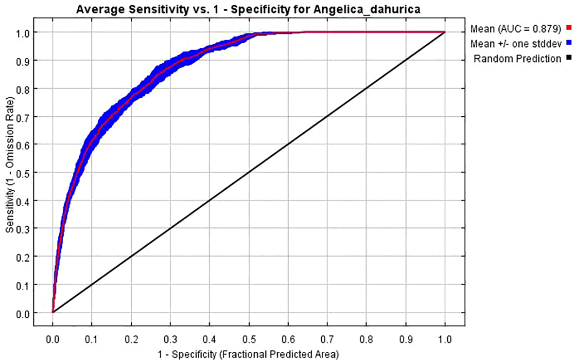 Based on 234 A. dahurica distribution points and 18 environmental variables layers, and the AICc information criterion, the potential distribution area of A. dahurica was simulated and predicted using the MaxEnt model. With MaxEnt default parameter settings, the RM=1, the FC=LQHPT, and the delta.AICc=8.09353. We optimized the model to obtain results when delta.AICc = 0, RM = 1.5 and FC = LQHPT, when the model is optimal and the 10% training omission value is lower than that of the model with default parameters (Table 2). For this reason, the modulation multiplier RM=1.5 and FC=LQHPT were selected as the final parameters of the model, and the AUC value of the simulated training under this parameter was 0.879 (Figure 2), which indicates that the prediction results were accurate. The TSS value was 0.62. Therefore, these assessment methods showed that the accuracy of using the model to predict the distribution of potentially suitable habitats for A. dahurica was relatively high.