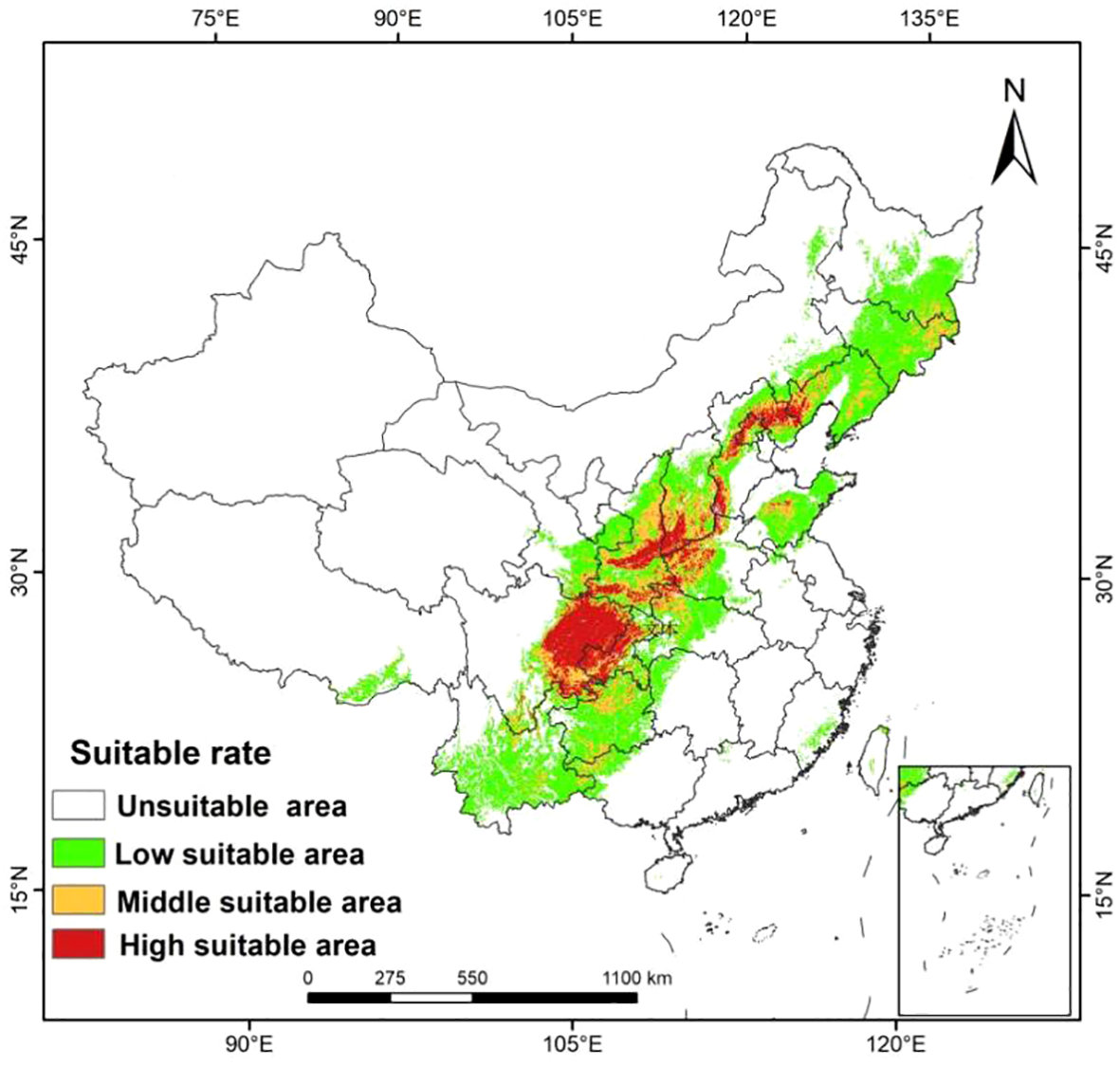 | scenarios | Unsuitable area | Low suitable area | Middle suitable area | High suitable area | Total suitable area |