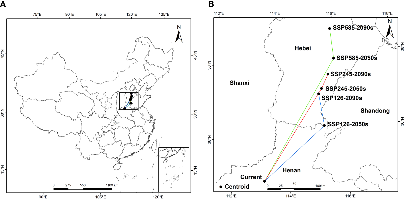 Geographical distribution changes of the centroid of the suitable area of A. dahurica under different climate scenarios [(B) is an enlargement of the part of (A)].