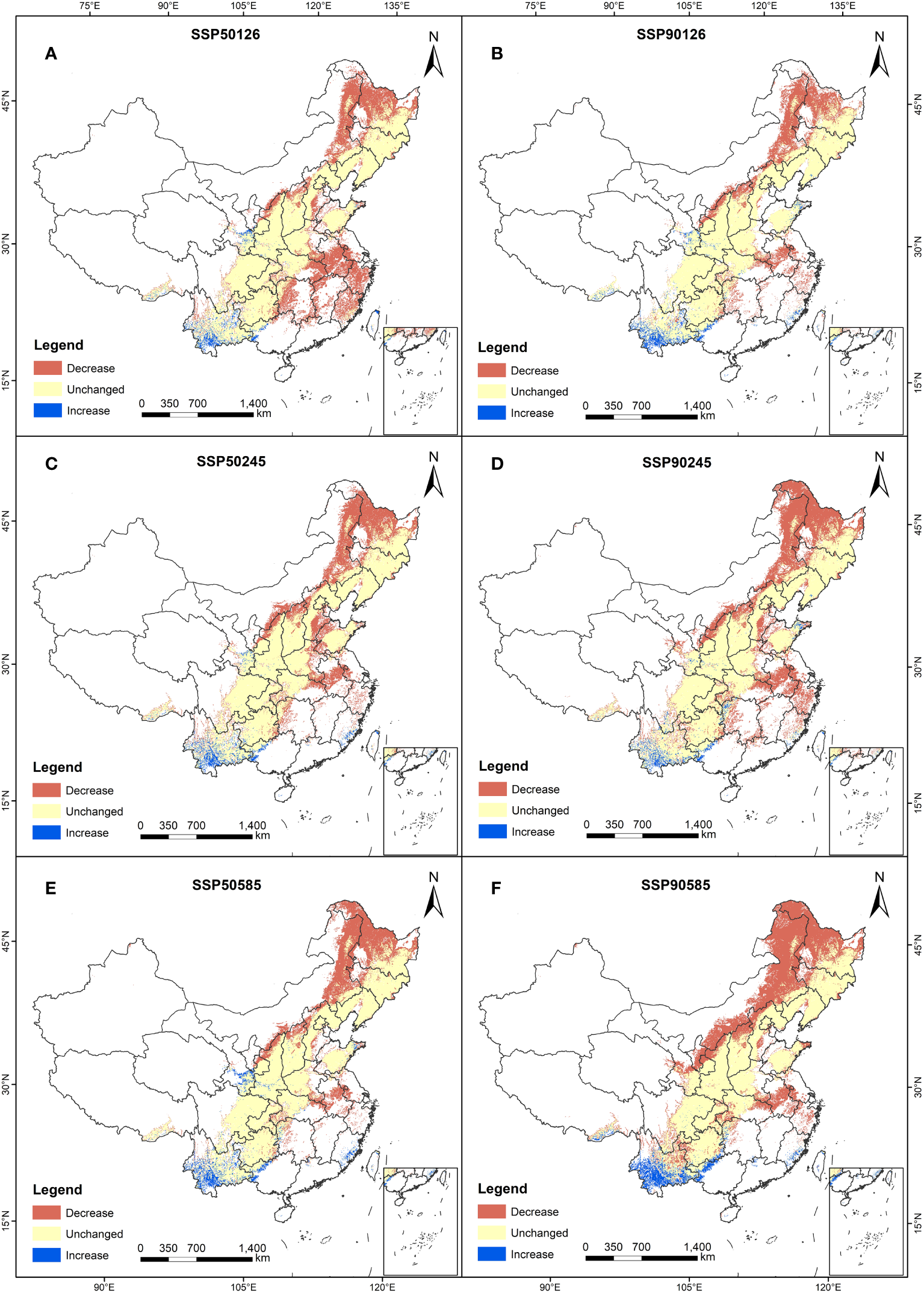 Spatial changes in A. dahurica. in China in ssp126 (A, B), ssp245 (C, D), ssp585 (E, F) scenarios in the 2050s (A, C, E) and 2090s (B,D, F).