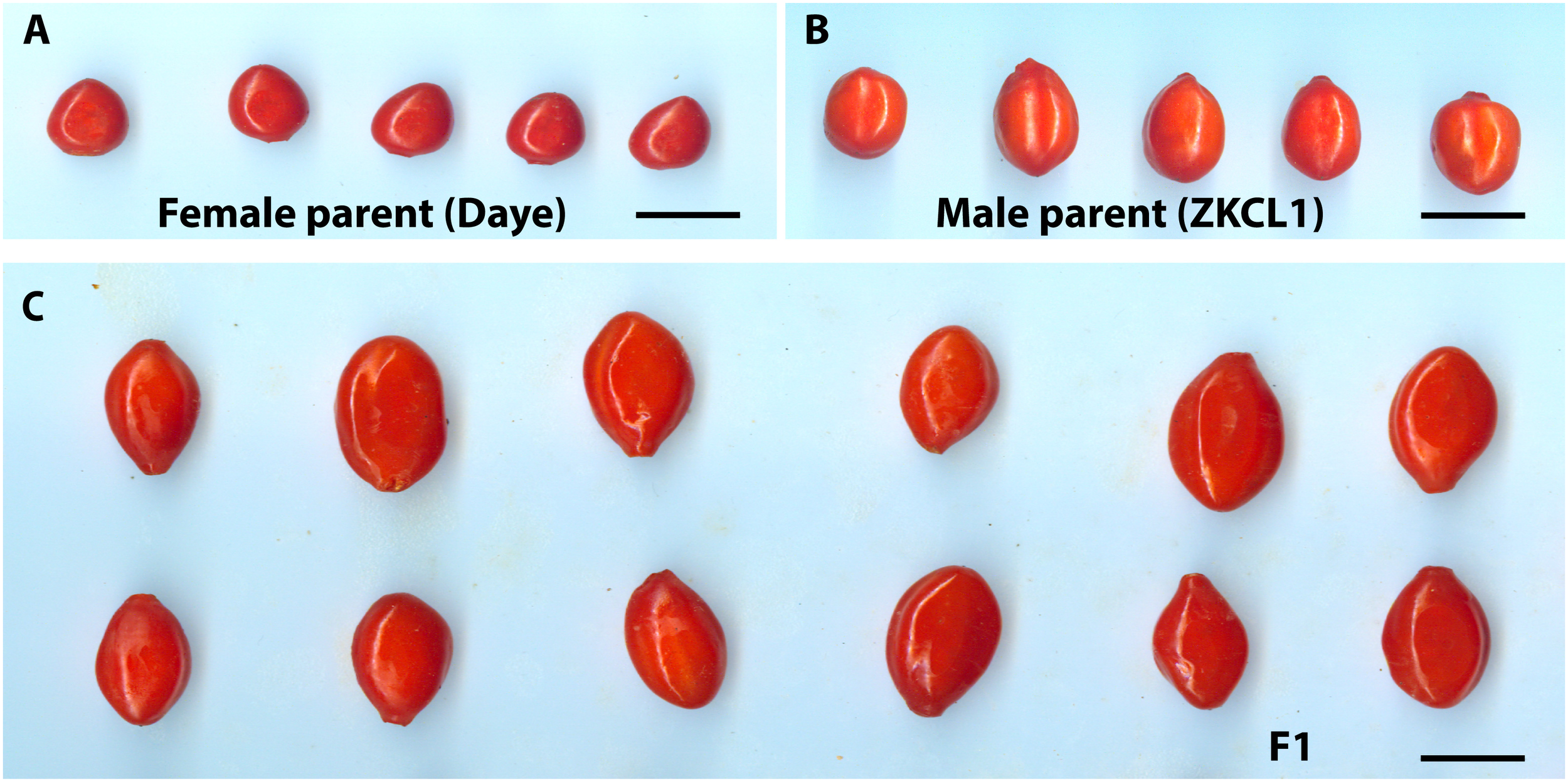 Goji fruits appearance of parents and F1 hybrid progeny. (A) Fruits of female parent Chinese goji cv. Daye (Lycium chinense); (B) Fruits of male parent Lycium barbarum cv. ZKLC1; (C) Randomly chosen F1 individual fruits with significant differences in fruit shape and sizes, bars = 1 cm.