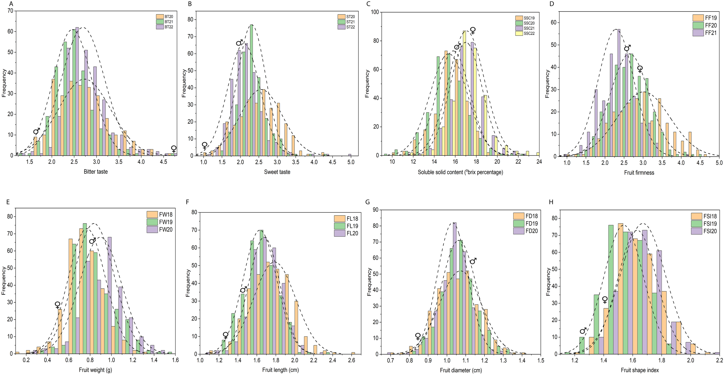 Frequency distribution histogram of 305 F1 individuals for physio-chemical and morphological traits based on three or four individual years. (A–H) Frequency distribution histogram of 305 F1 individuals for bitter taste (A), sweet taste (B), soluble solid content (°brix percentage) (C), fruit firmness (FF) (D), fruit weight (FW) (E), fruit length (FL) (F), fruit diameter (FD) (G), fruit shape index (FSI) (H), based on three or four individual years. Each x-axis represents the value of the trait and the y-axis shows the number of individuals corresponding to the value on the x-axis. BT20, BT21, BT22 bitter taste (2020, 2021, 2022), ST20, ST21, ST22 sweet taste (2020, 2021, 2022), SSC19, SSC20, SSC21, SSC22, soluble solid content (°brix percentage) (2019, 2020, 2021, 2022); FF19, FF20, FF21, fruit firmness (2019, 2020, 2021); FW18, FW19, FW20, fruit weight (2018, 2019, 2020); FL18, FL19, FL20, fruit length (2018, 2019, 2020); FD18, FD19, FD20, fruit diameter (2018, 2019, 2020); FSI18, FSI19, FSI20, fruit shape index (2018, 2019, 2020);♀, indicate female parent location on histogram, ♂, male parent location on histogram.