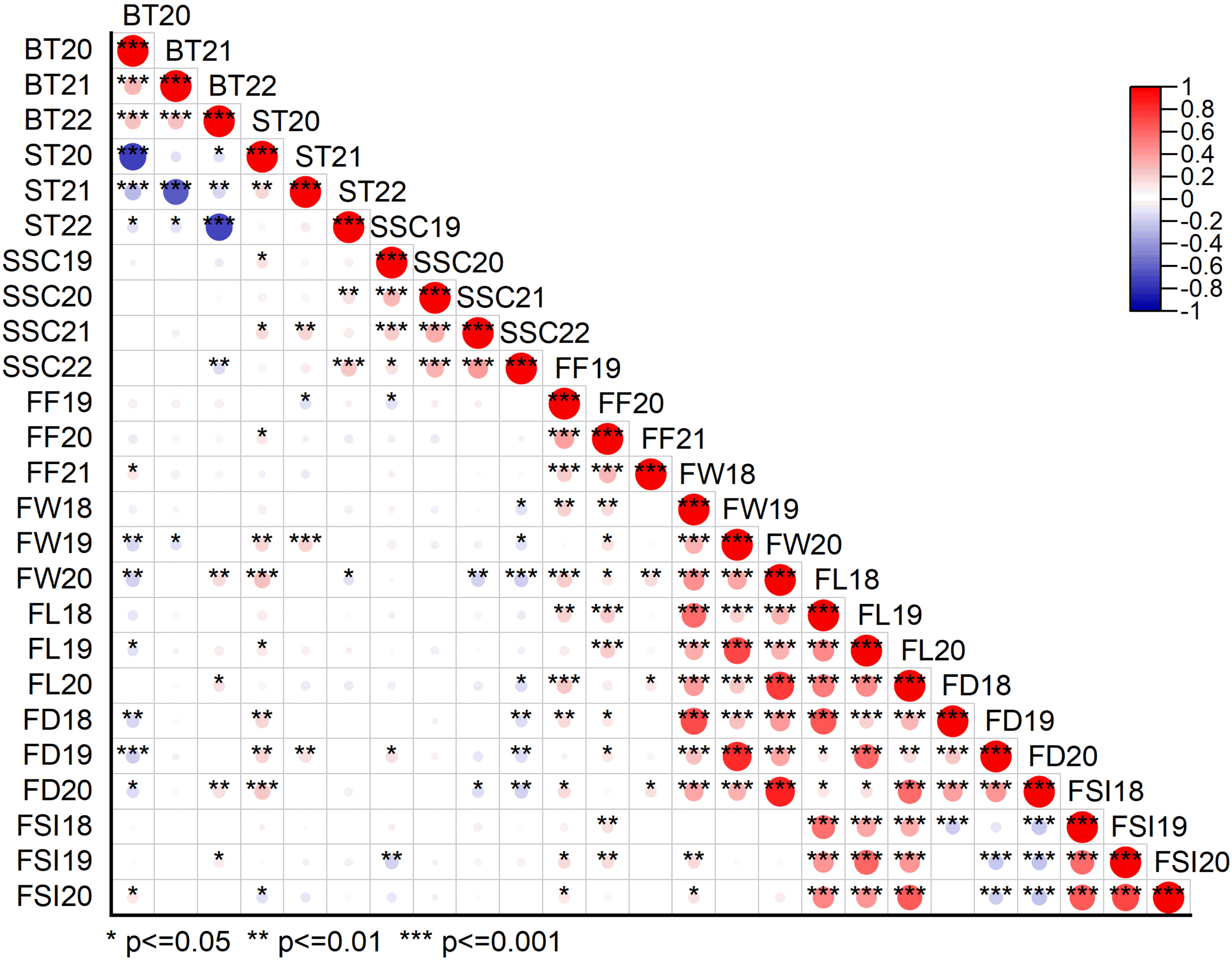 Pearson correlation matrix plot showing the relationship between different physio-chemical and morphological traits under three or four individual years data. BT20, BT21, BT22 bitter taste (2020, 2021, 2022), ST20, ST21, ST22 sweet taste (2020, 2021, 2022), SSC19, SSC20, SSC21, SSC22, soluble solid content (°brix percentage) (2019, 2020, 2021, 2022); FF19, FF20, FF21, fruit firmness (2019, 2020, 2021); FW18, FW19, FW20, fruit weight (2018, 2019, 2020); FL18, FL19, FL20, fruit length (2018, 2019, 2020); FD18, FD19, FD20, fruit diameter (2018, 2019, 2020); FSI18, FSI19, FSI20, fruit shape index (2018, 2019, 2020).