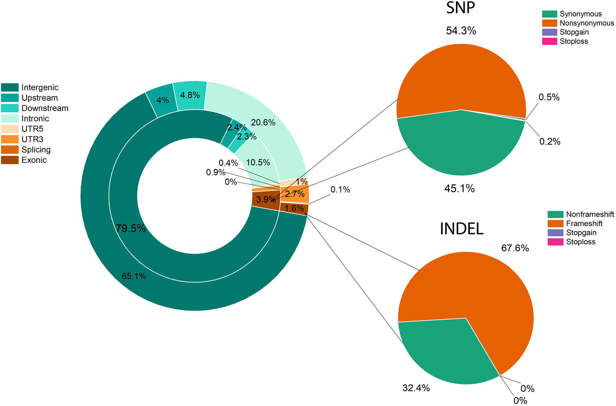 Variant distribution and annotation for SNPs and InDels. Genome annotation and functional annotation of SNPs and InDels. The left doughnut diagram is the result of the genome annotation, the inner circle is the SNP, and the outer circle is InDel. The right pie chart is the functional annotation for SNP (top) and InDels (bottom).