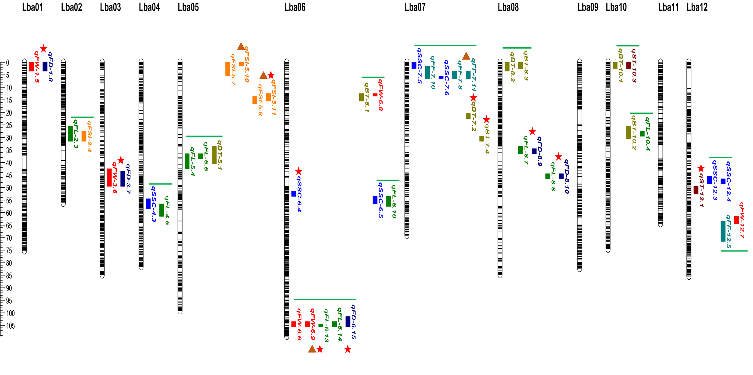 Soluble Solid Content (SSC) (°brix percentage): Sixteen genomic regions corresponding to SSC were located on different chromosomes (Supplementary Table 9), including qSSC-6.4, a major-effect locus, with an LOD score of 15.24 and 11.50% variance. Additionally, 11 QTLs (qSSC-4.3, qFL-4.5; qSSC-6.5, qFL-6.10; qSSC-12.3, qSSC-12.4; qSSC-7.5, qFF-7.10; qSSC-7.6, qFF-7.8, qFF-7.11) were detected as overlapping loci corresponding to different traits with a maximum LOD of 7.25 and 6.22% phenotypic variance (Figure 5; Supplementary Table 9).