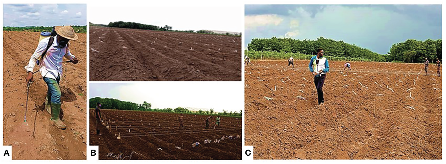 (A) Land preparations. (B) Marking. (C) Laying of planting materials.